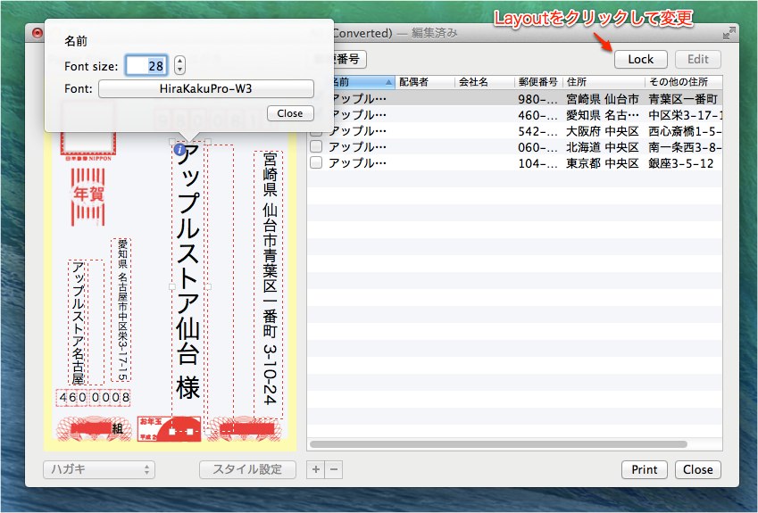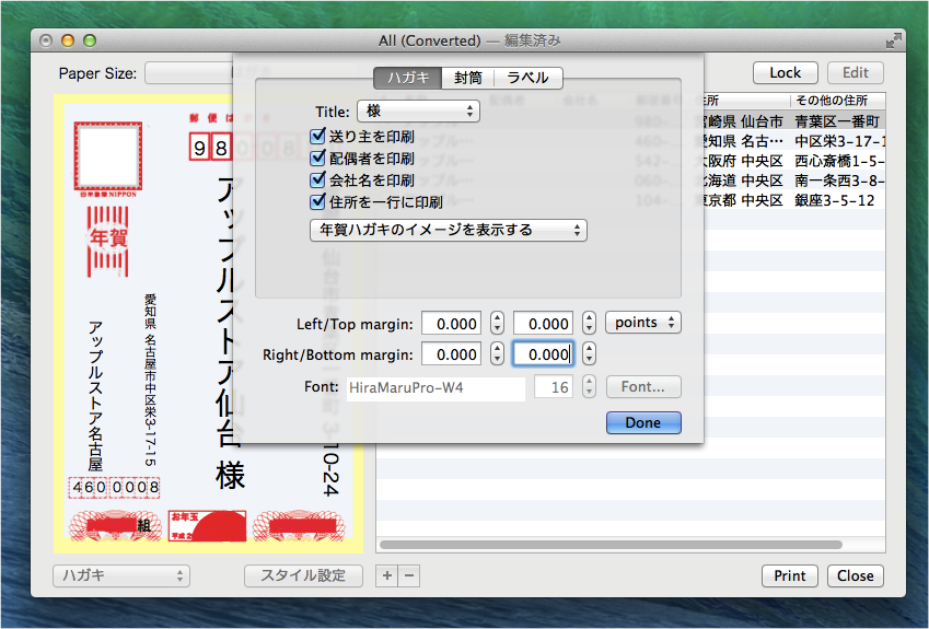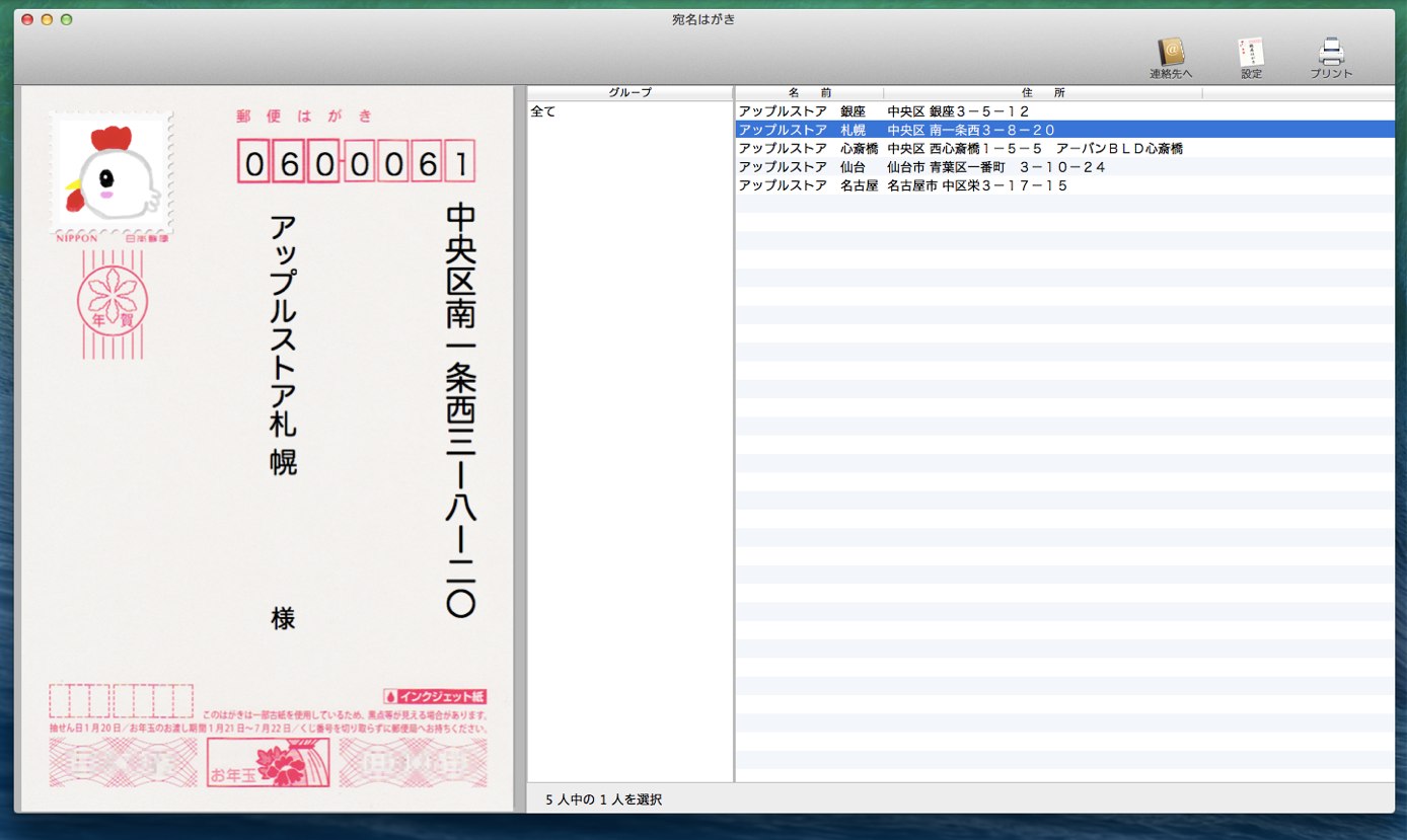 *以上2つはあくまでもOS X の連絡先.appから宛名だけ印刷したい時のアプリです。裏面は「はがきデザインキット」などでどうぞ。