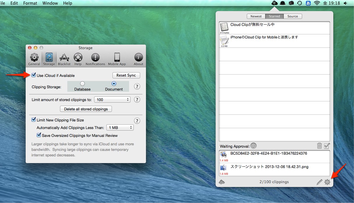 また、Macでサイズの大きいファイルをコピーした場合、Cloud Clipの[Waiting Approval(承認待ち)」の欄に入るのでiCloudに上げたい場合はチェックを入れて承認してあげて下さい。