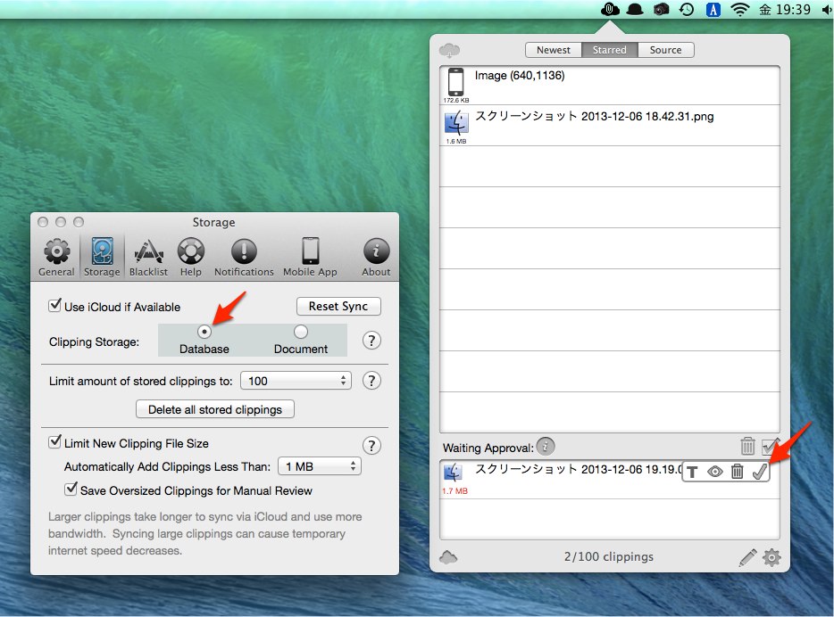 *承認が必要なファイルサイズはPreferencesの[Storage]>[Limit New Clipping File Size]から設定できます。