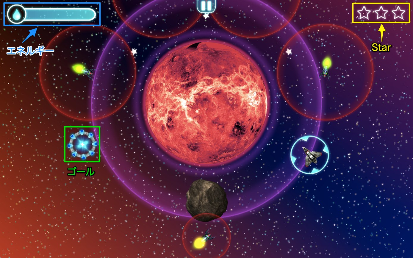 ステージ中には3つのボーナススター、敵、重力を発生させる惑星などがあり、左上のエネルギーがある間は推進力で姿勢制御可能です。たまにアドオン(シールドや宇宙船)購入を促されますが無くても十分遊べます。