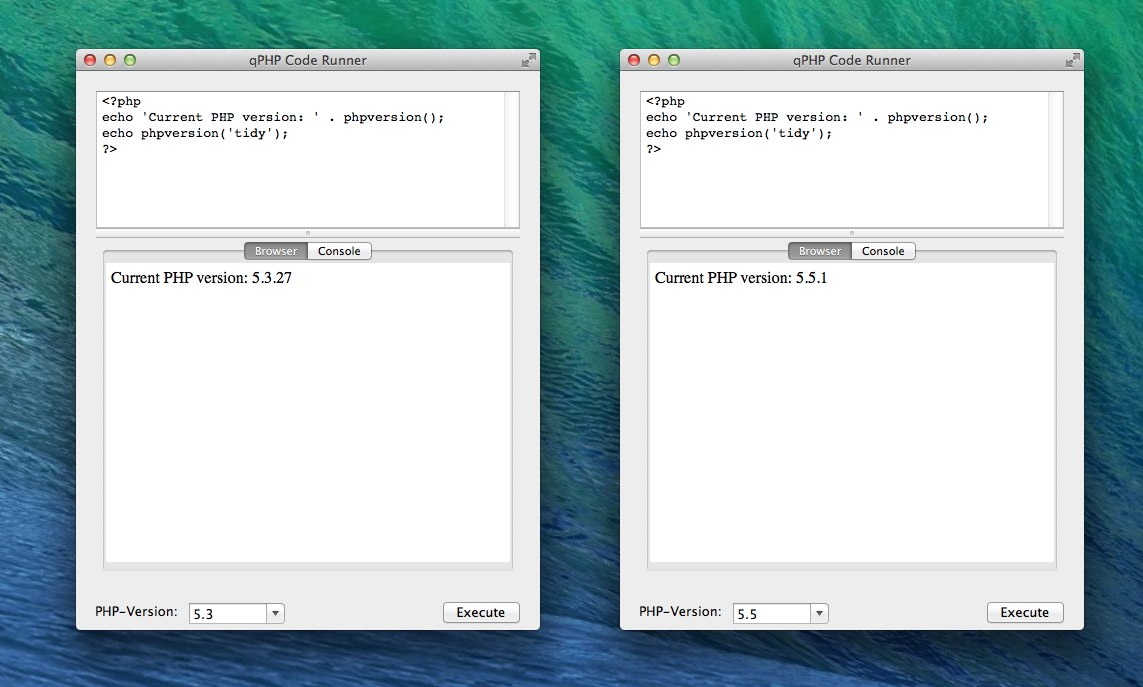 qPHPはPHPのサンプルコードをPHPのバージョンを変えて実行できるアプリです。