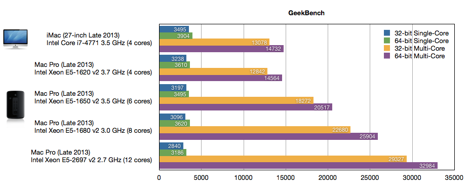 そのおかげでCore数に比例してGeekBenchのMulti-Coreスコアも(線形に)上昇している。しかし、Single-Coreについて見てみれば、12-CoreはActiveCore 1の時、動作周波数3.5GHzなのでMac Pro Late 2013の中でも一番低く、4, 6, 8-CoreはActiveCore 1の時 3.9GHzで動作するのであまりベンチマークスコアに差がない。