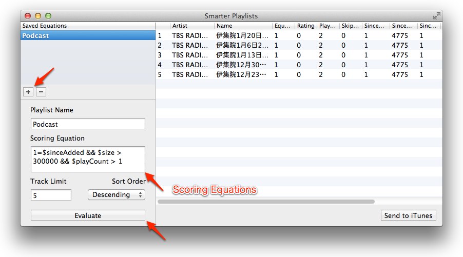 使い方は[+]ボタンで新規プレイリストを作成し、「Scorign Equation」を入力して[Evaluate]ボタンを押せば自動的にiTunesの情報を解析してプレイリストを作成してくれます。