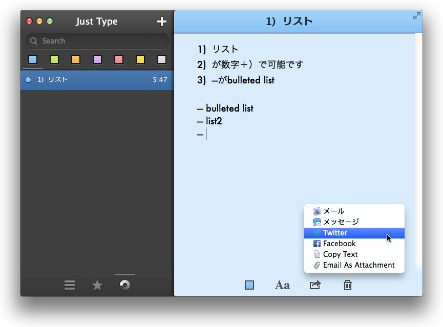 表示方法は「全てのノートをリスト表示」「☆付きノートを表示」「ノートのカラーで表示」の3種類で、”1. “や”1) “でのオートリスト化、メール, Message, Twitter, Facebook, メール添付ファイルのいずれかの方法でShareも出来ます。