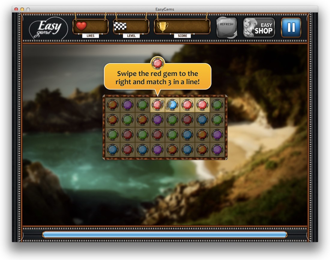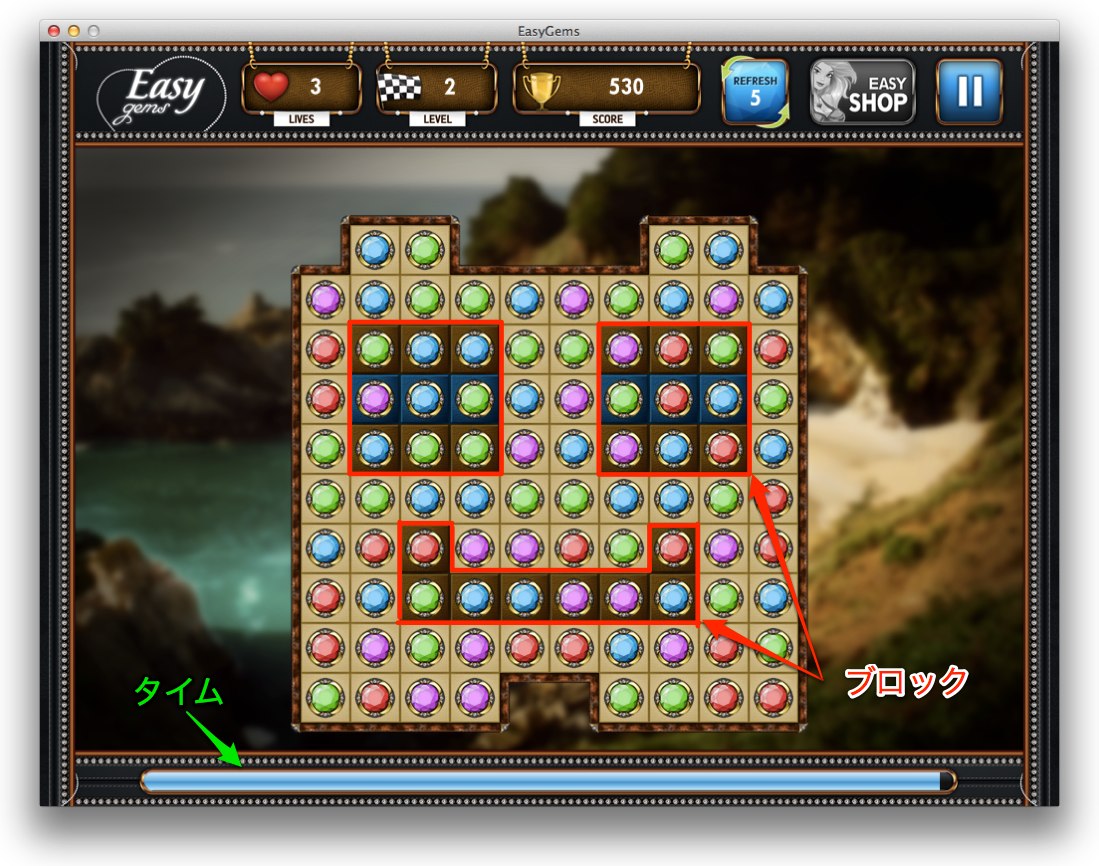 遊び方は宝石(Gem)を入替えて3つ並べることでステージ中のブロックを破壊し、全てのブロックを破壊すればクリアとなります。
