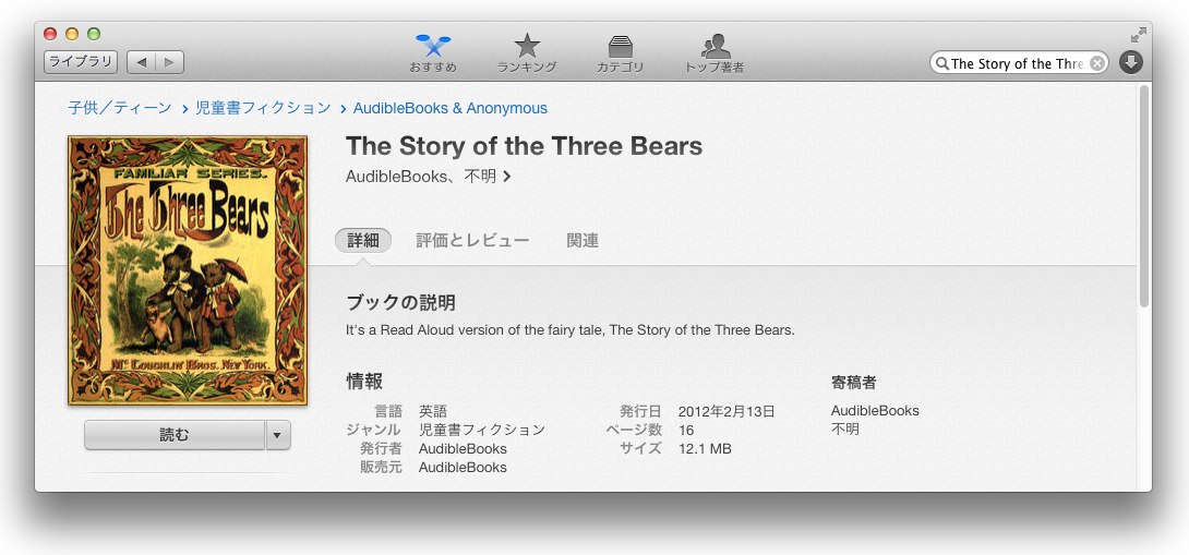 英語の朗読音声付きブックは「Read Aloud」で検索でき、日本語の場合は「朗読音声付」で検索すると日本語の朗読音声付きブックが出てきます。