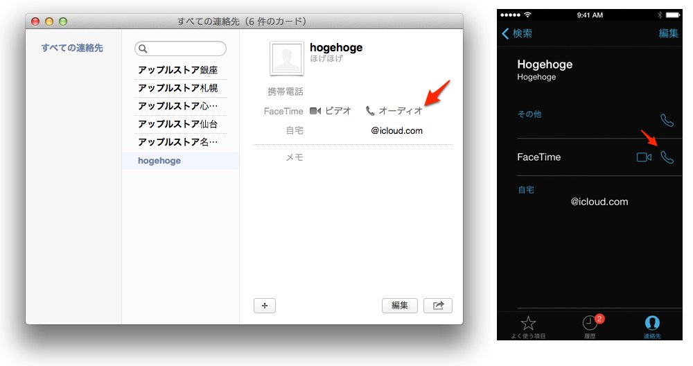 2.OS X 10.9.2のFaceTimeアプリやアドレスブック、iOSのFaceTimeアプリにFaceTime Audioのアイコンが現れるので通話。