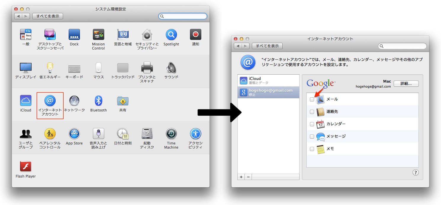 1.Mail.appでGmailをIMAPで使用するとクラッシュするようなので、とりあえず「システム環境設定」から[インターネットアカウント]を選択し、GmailアカウントからメールをOFFにします。