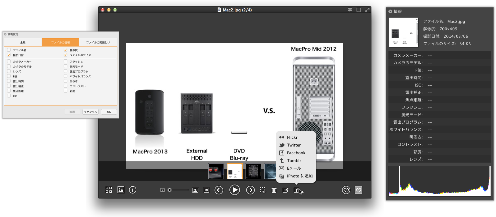 設定まで全て日本語にローカライズされており、また画像の入ったフォルダをドラッグ&ドラッグすると下にサムネイル表示しながらカバーフローのように表示できます。