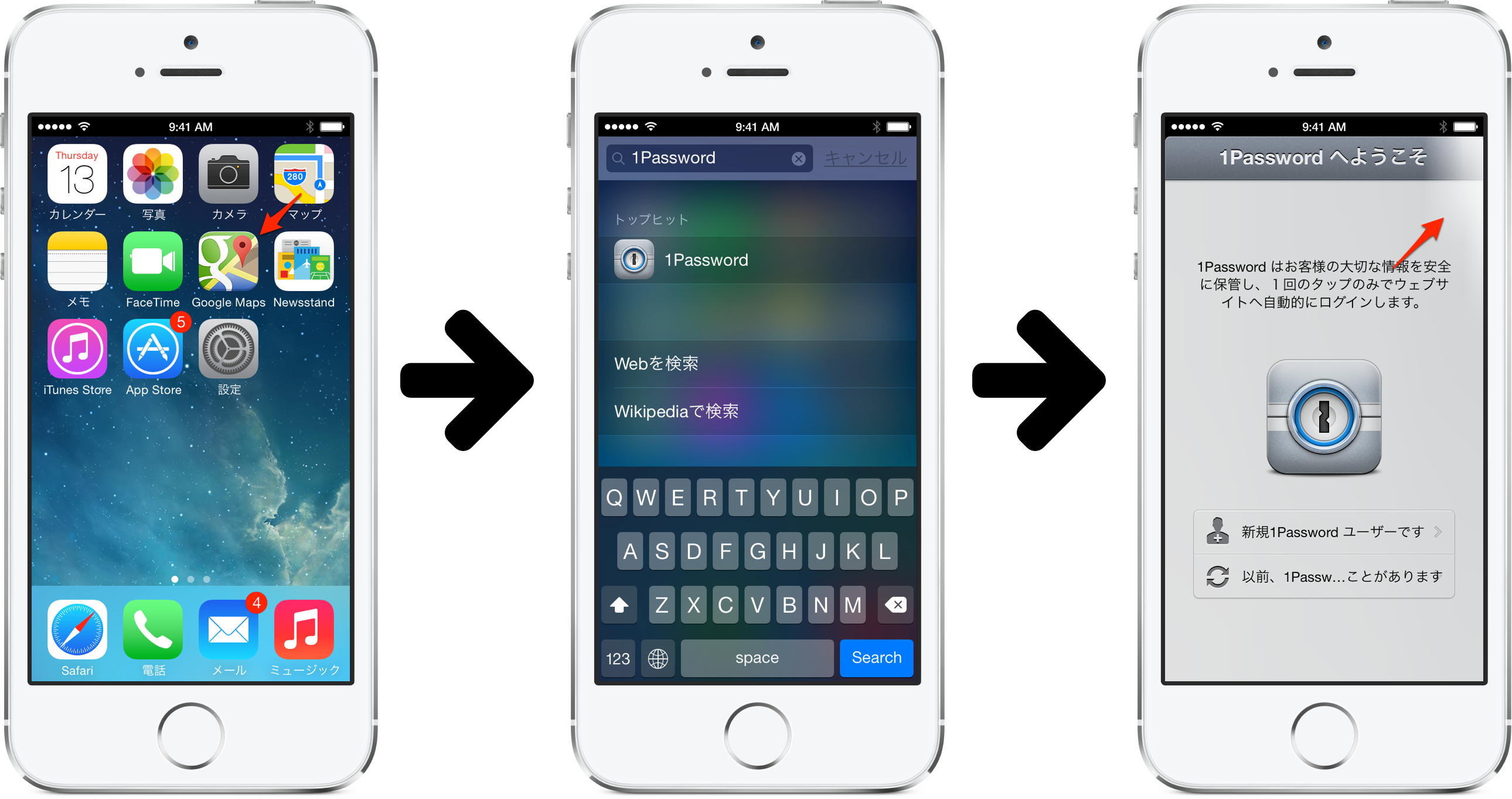 光漏れ(Google Map残像)を再現するにはiPhoneのホームスクリーンの上から2行目真ん中(2, 3列目)にGoogle Mapを置いた状態で、Spotlightから特定のアプリ(ここでは1Password)を起動します。