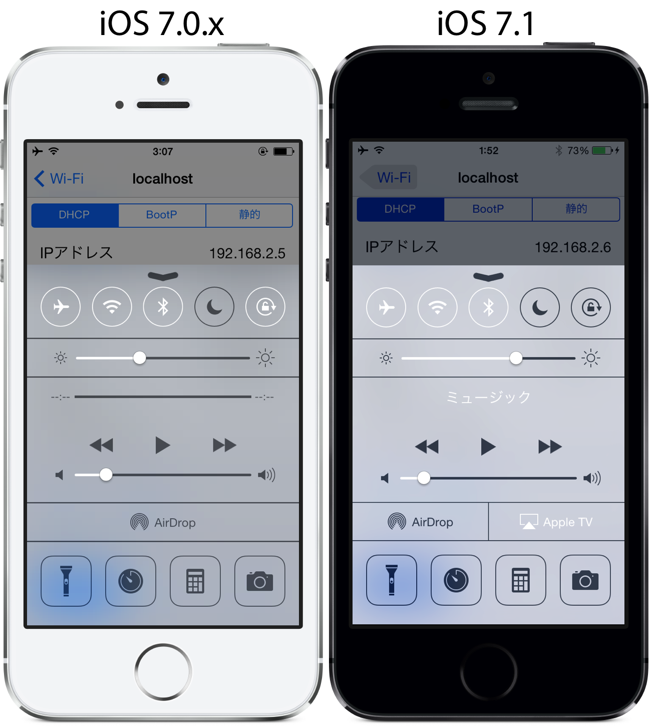 3.次にサブネットに接続したiOS 7.0.xとiOS 7.1でWi-Fi & BluetoothをONにしてみると、iOS 7.1デバイスのコントロールセンターだけ「AirPlay」のボタンが現れます。