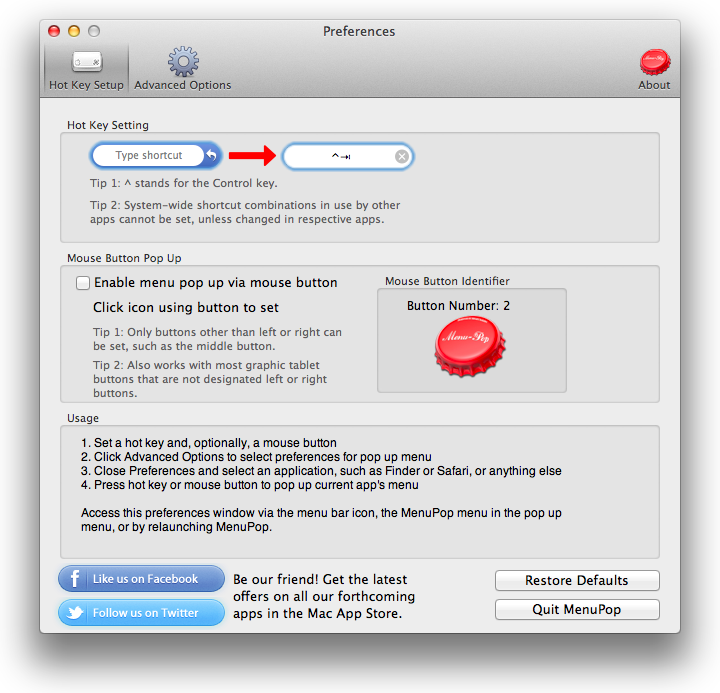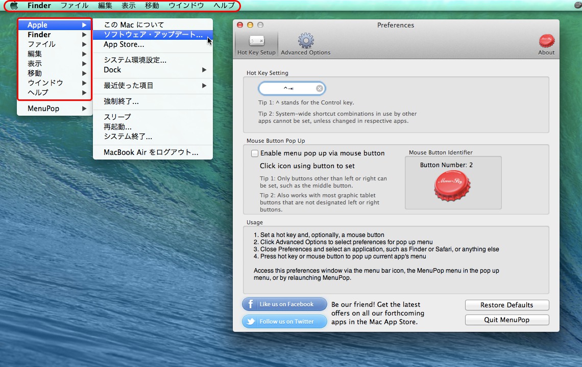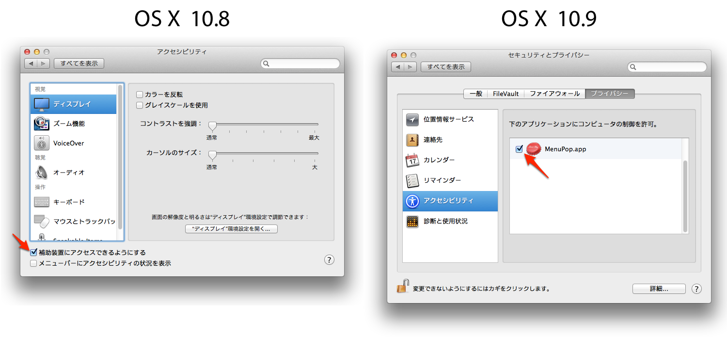 このアプリはアクセシビリティのAPIを使用するのでOS X 10.8までの場合は[補助装置にアクセスできるようにする]をONに、OS X 10.9の場合は[セキュリティとプライバシー]>[アクセシビリティ]にあるMenuPopをONにしてください。