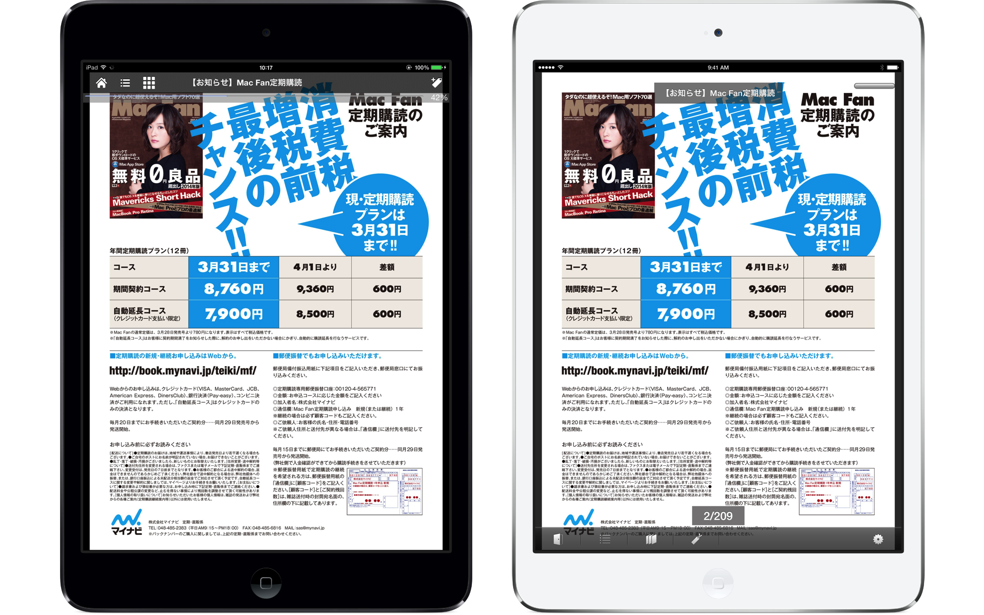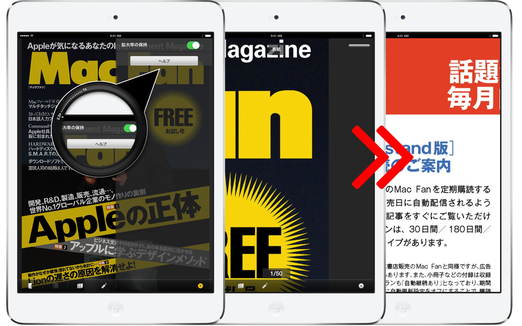 Mac, iPhone, iPad系の専門雑誌「MacFan」のNewsstand版が2013年3月にiOS 6に対応した以来の大幅デザイン修正をしています。