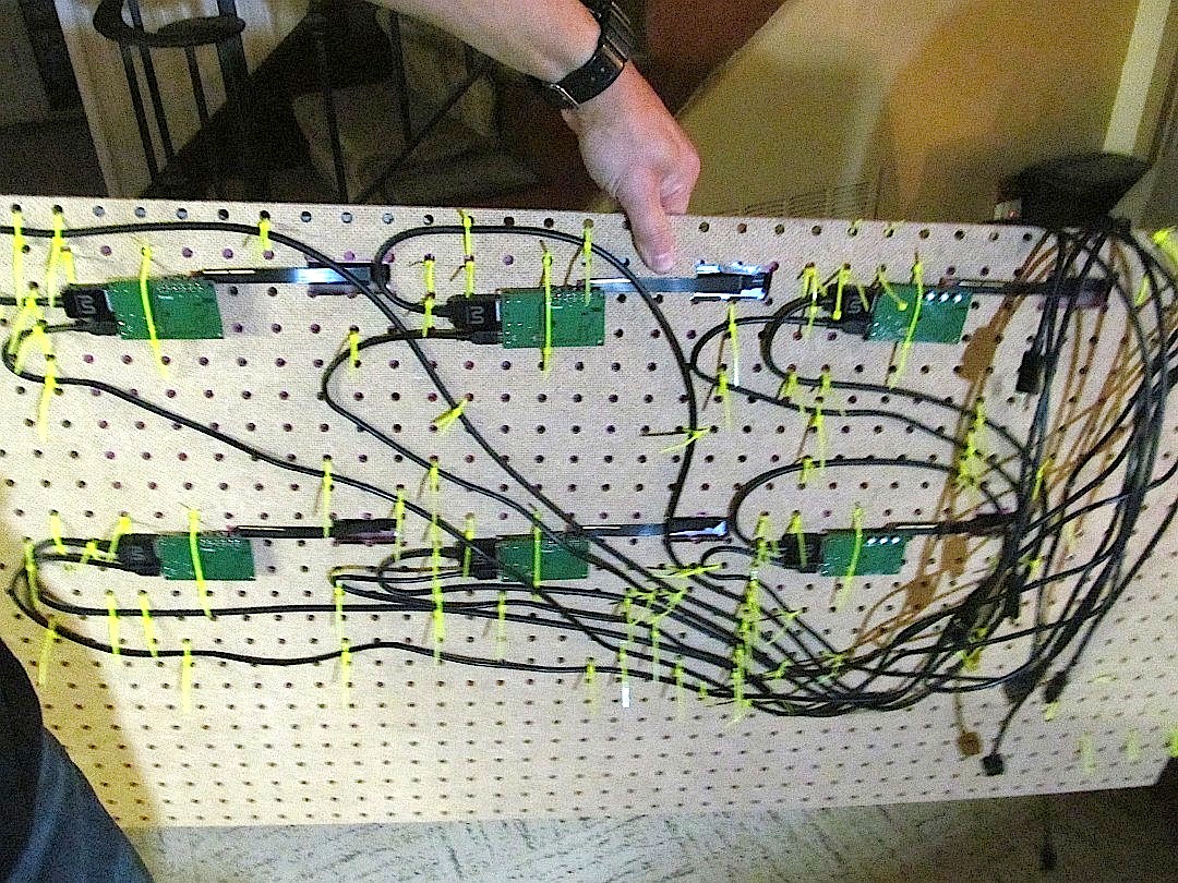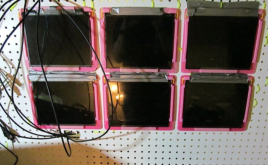 使用しているのはAbuseMarkの「2048×1536 LCD to DisplayPort Adapter」で、まずデュアルディスプレイができる事を確認し、その後計6枚のRetinaディスプレイとアダプターを購入、例のごとくケースがないので始めのうちは有孔ボード(pegboard)に設置、