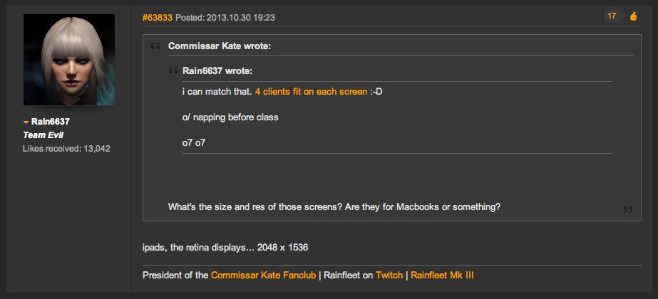 Rain6637さんはEVE Onlineをマルチディスプレイ環境でプレイするために、iPad用のRetinaディスプレイを使い始め、最初は2枚、次に6枚と増やしていき今は8枚のRetinaディスプレイで8192x3072pix環境を構築しているそうです[1, 2]。