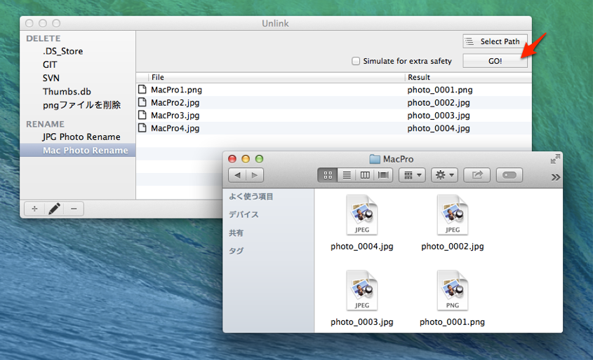 変更後のファイルが確認できたら最後に[Go]をクリックでリネームや削除が始まります。