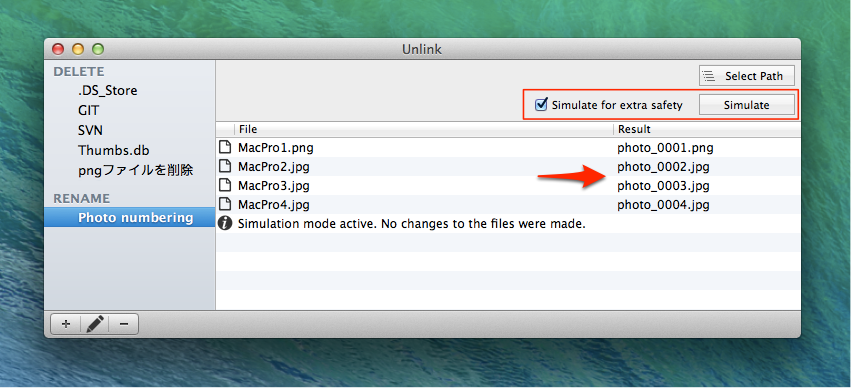 次に[Select Path]で変更したいファイルが有るディレクトリを選択し、[Simulate for extra safety]にチェックをして[Simulate]を選択すると削除またはリネームされるファイルが表示されます(この状態ではまだ変更されません)。