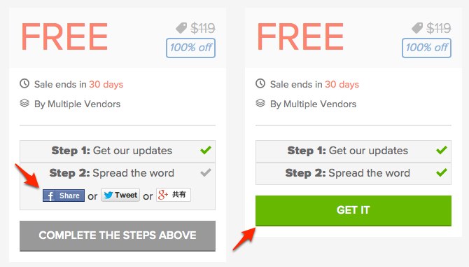 キャンペーンに参加するにはStackSocialのアカウントかFacebookアカウントでログインし、Facebook, Twitter, Google+でシェアすると[GET IT]ボタンが現れダウンロードリンクとライセンスルコードが表示されます。