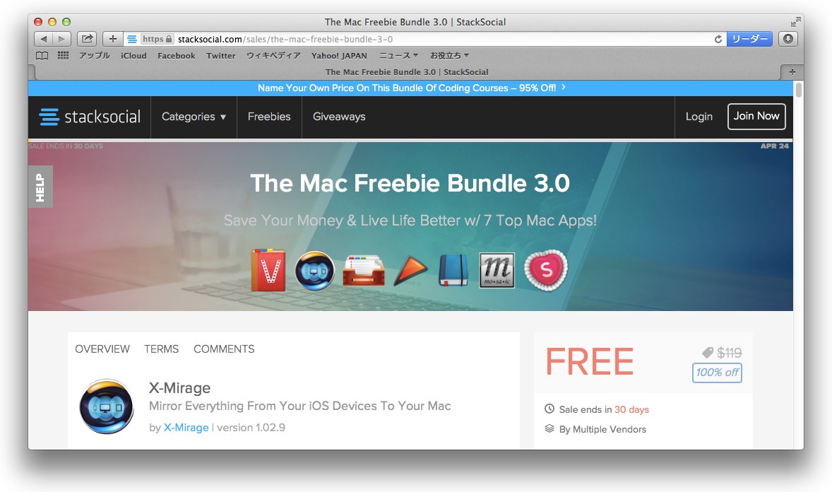 「The Mac Freebie Bundle 3.0」はX-MirageやClipBuddyなど計119ドル分のアプリ7個をダウンロードできるプロモーションキャンペーンです。