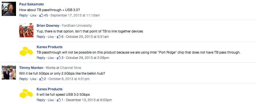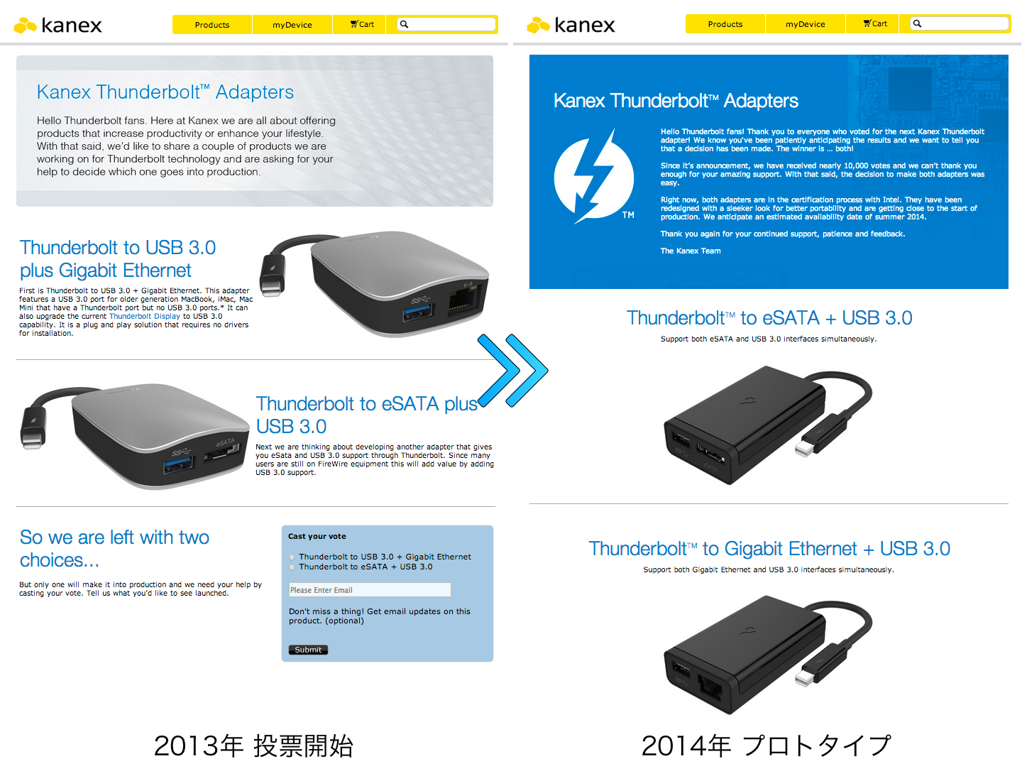 Kanexのサイトには2013年10月に「Thunderbolt to USB 3.0アダプターを作ってるんだけど、もう1つのインターフェイスをGigabit EthernetにするかeSATAにするかで悩んでるので、皆さんがどちらか1つ選んで下さい」っという投票フォーラムがありましたが、結局「1万以上の投票があり反響が大きかったので両方とも作ります!」という結果になったそうです。