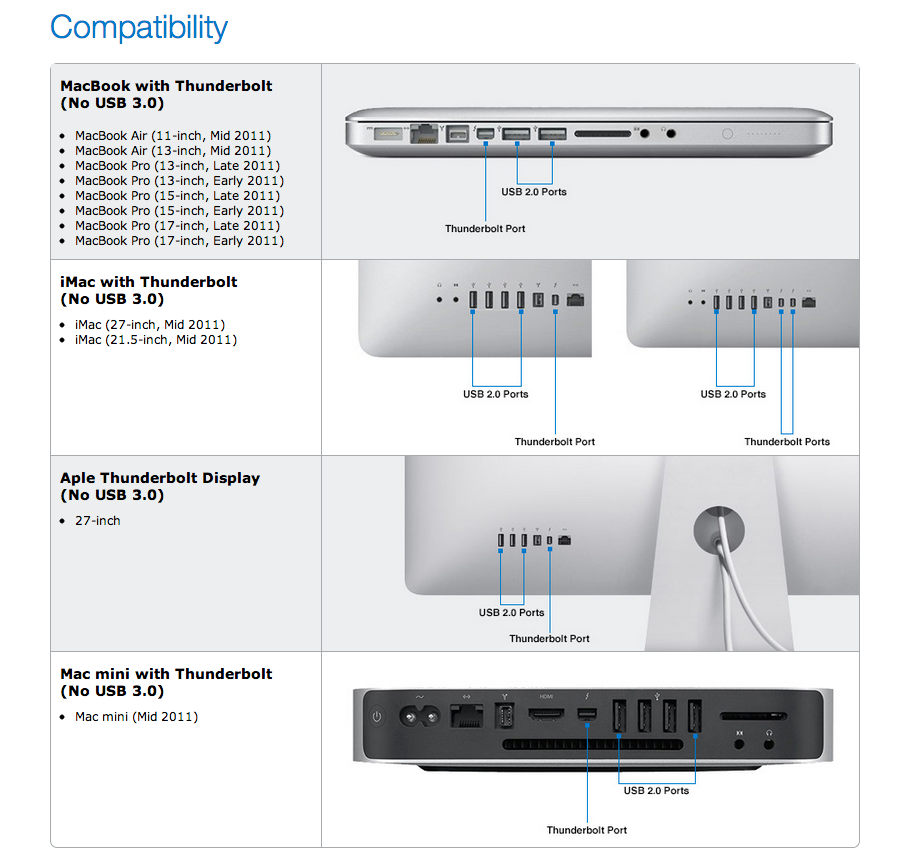 Thunderbolt付きで、USB 3.0ポートが無いKanex Thunderbolt to USB3.0アダプターが使用できるMacは以下のモデルですが、2012年度以降のThunderbolt付きMacでも一応使えるようです。