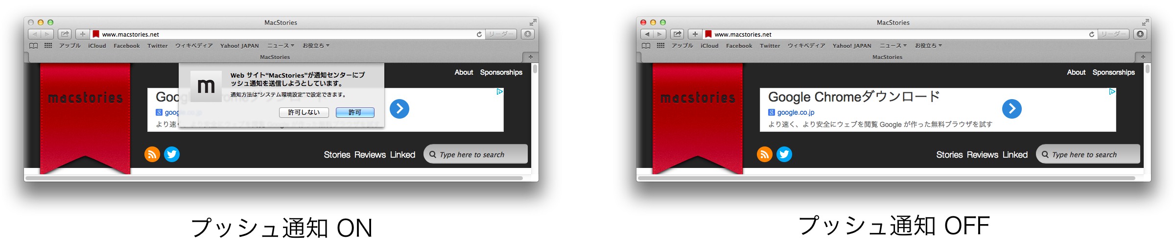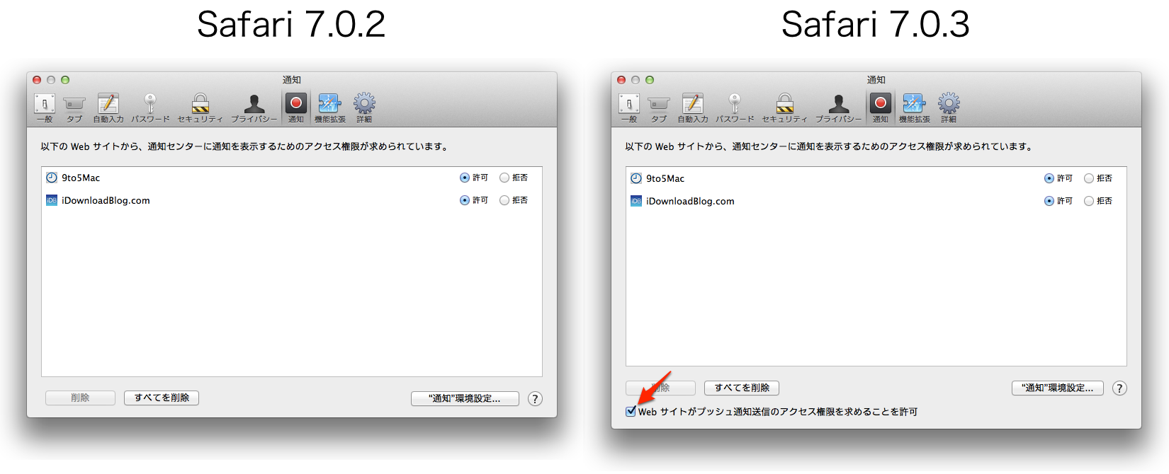 環境設定の通知には新たに「Web サイトがプッシュ通知送信のアクセス権限を求めることを許可」のオプションが付き、
