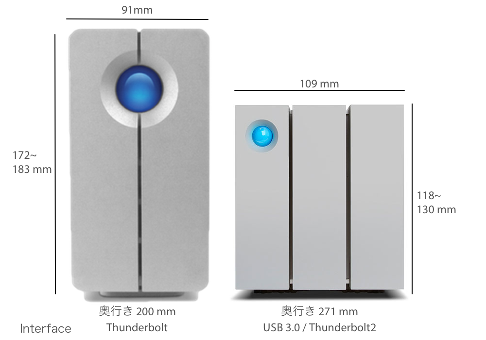 発売されるのは6TB, 8TB, 12TBの3製品で、旧 2bigはThunderboltインターフェイスのみでしたが新2bigはThunderbolt 2を2ポートとUSB 3.0のデュアルインターフェイス、RAID 0/1/JBODに対応しAJA System TestではRAID0, 4096×2160 10bit RGB, ファイルサイズ8GBでWrite 325.5 MB/s, 413.4 MB/sとなっています。