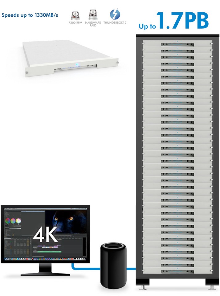 MacPro Late2013の6つのThunderbolt2ポートを使用すればデイジーチェーンで36U(1.79PB、 3000MB/s)のストレージシステムを構成することが可能だそうです。