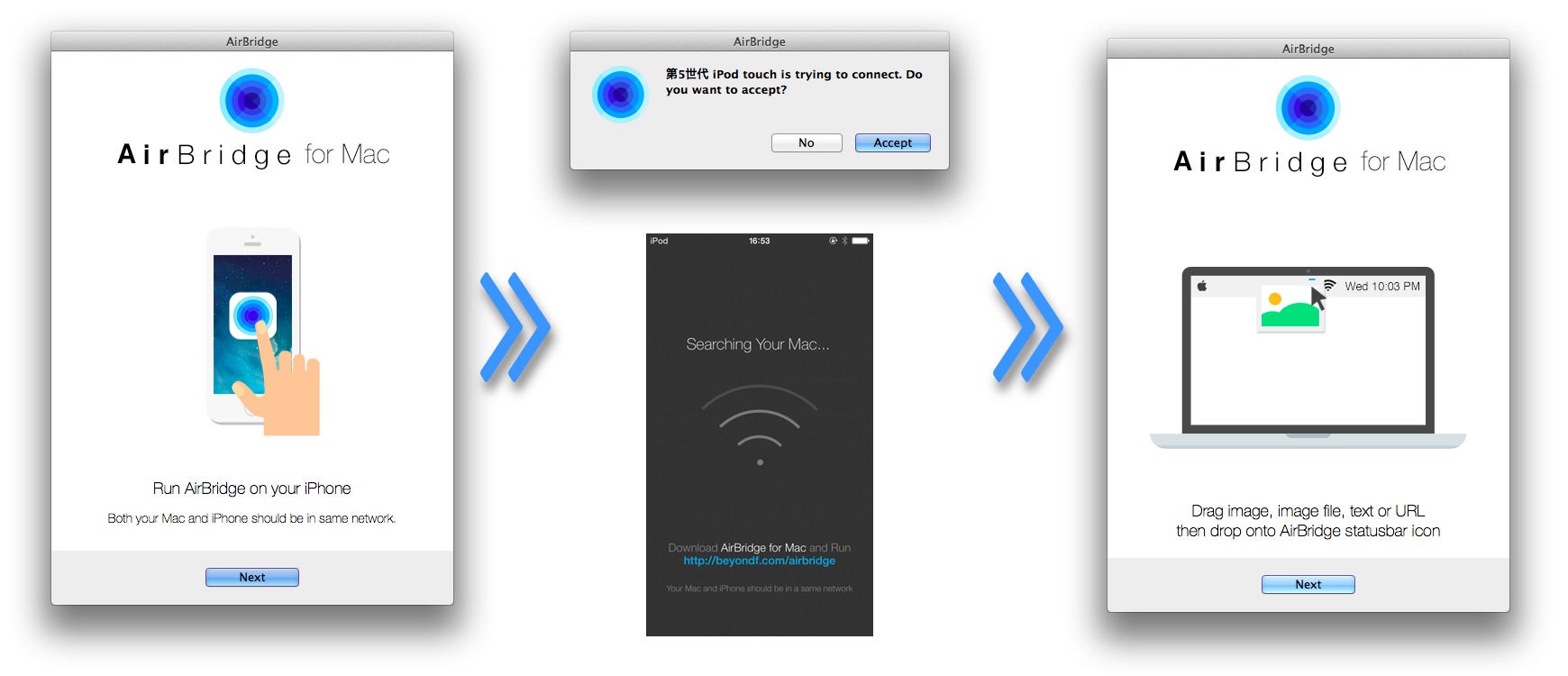 使い方はMacとiOSデバイスでAirBridgeを起動。デバイス間で接続を求められるので[Accept]。