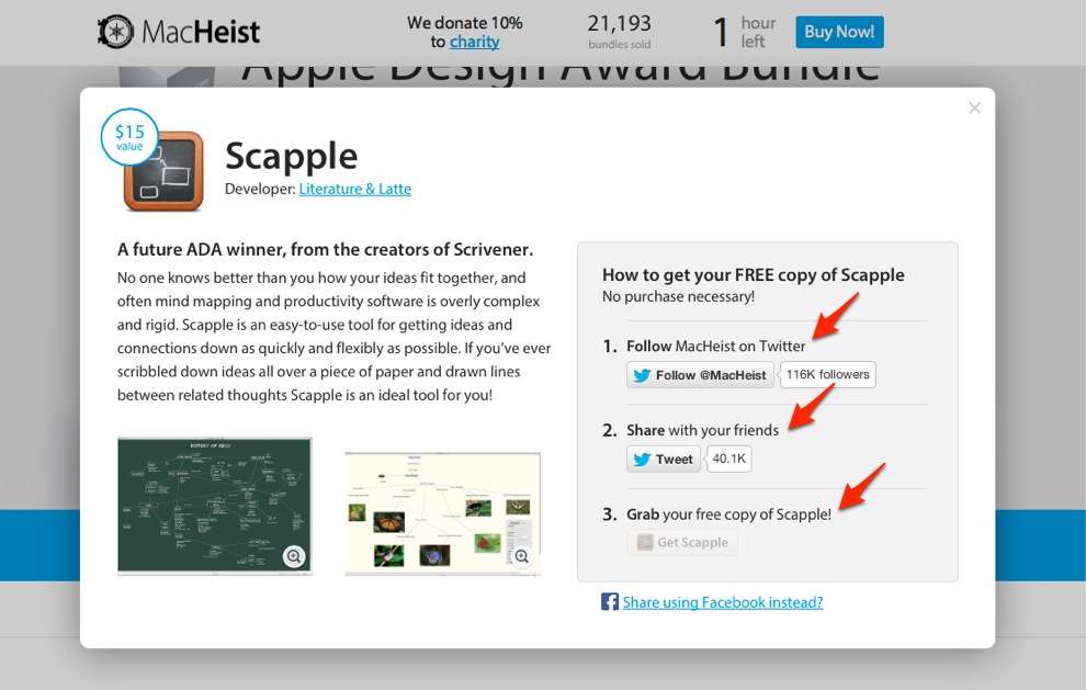 MacHeistからダウンロードする場合はTwitterで@MacHeistアカウントをフォロー、このキャンペーンをシェアしてユーザー登録するとアクティブコードとダウンロードリンクが現れます