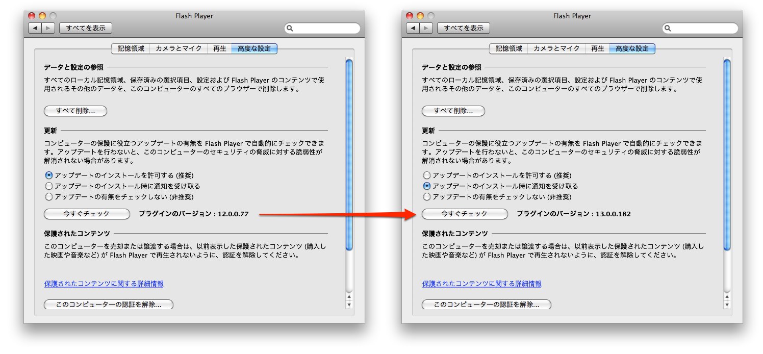 【速報】Mac版 Flash Player13の最新のアップデート(4月9日リリース)をインストール後にプラグインエラーで動画が再生できないという問題が報告されており、次のフォーラムで情報を更新中です。ご不便をおかけし申し訳ありません。http://t.co/kVz82yLTQf