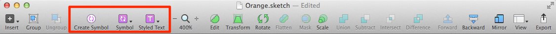 Sketch 3からズームイン・アウトの配置がツールバーに移り、新機能のSymbolsなどが設置できるようになっています。