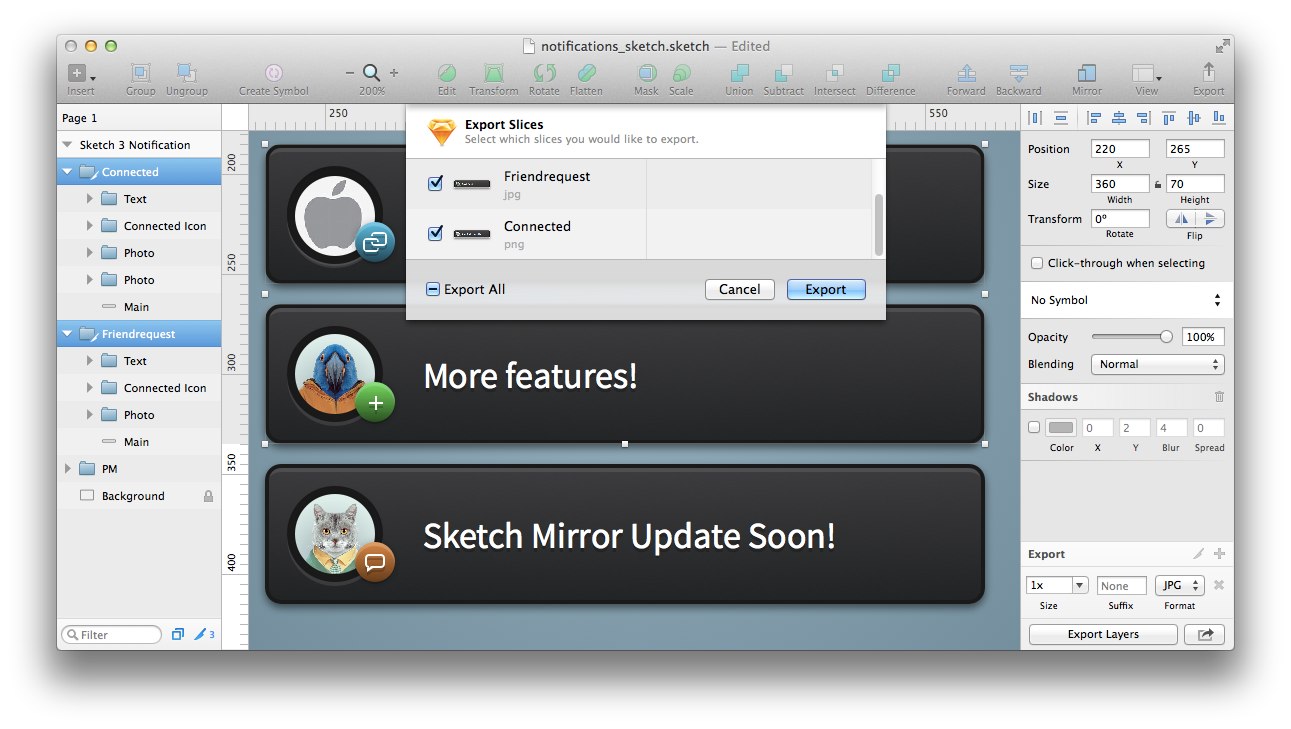 Sketch 3ではエクスポート機能が大幅にアップデートしており、各オブジェクトやレイヤーにエクスポートするフォーマットやサイズが設定可能で、