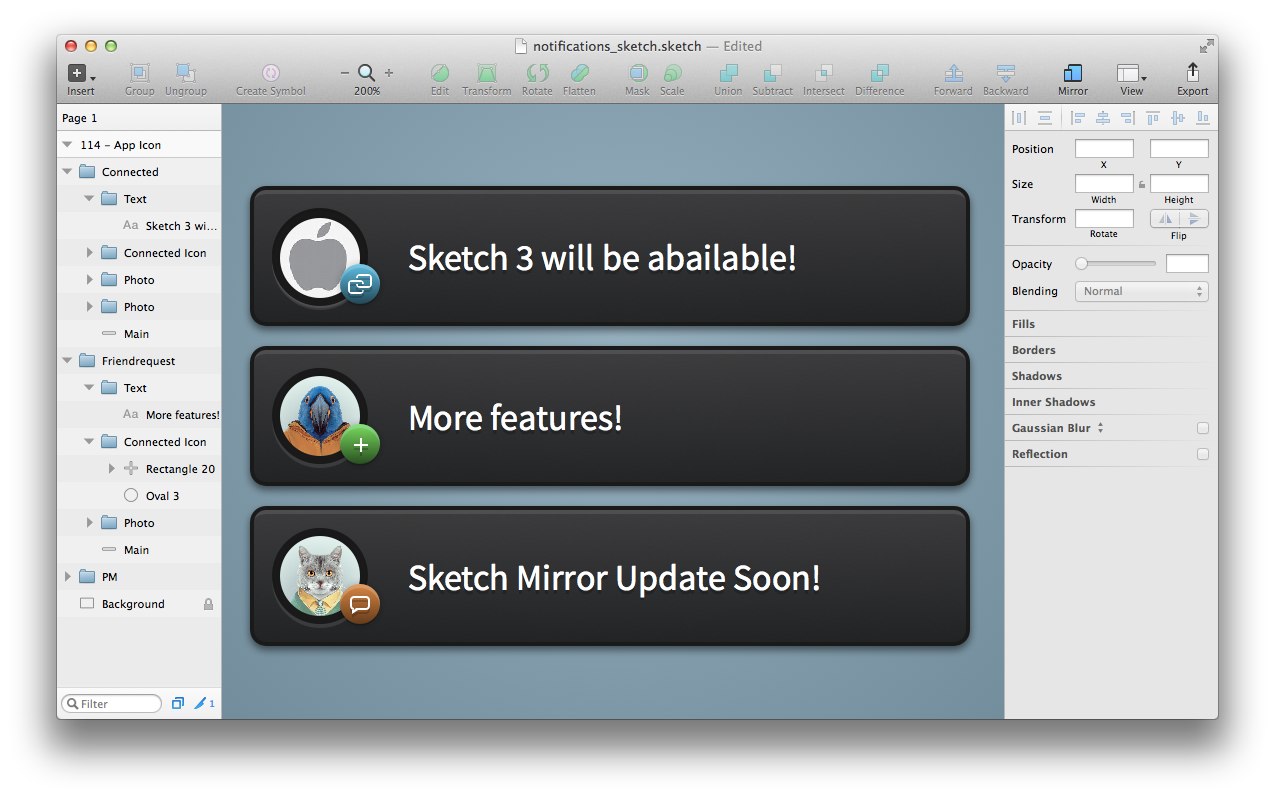 Sketch 3 is a major update, and we think you’ll love it. We’ve been listening to all of your feedback and requests and have strived to make Sketch 3 an even better product. With this new version, we have implemented our number one feature request: Symbols – the ability to re-use the same group in multiple places across your document, and have all copies sync when one is updated. In addition, we have shared layer and text styles, allowing you to share the same style across multiple shapes or text layers, keeping them all in sync.