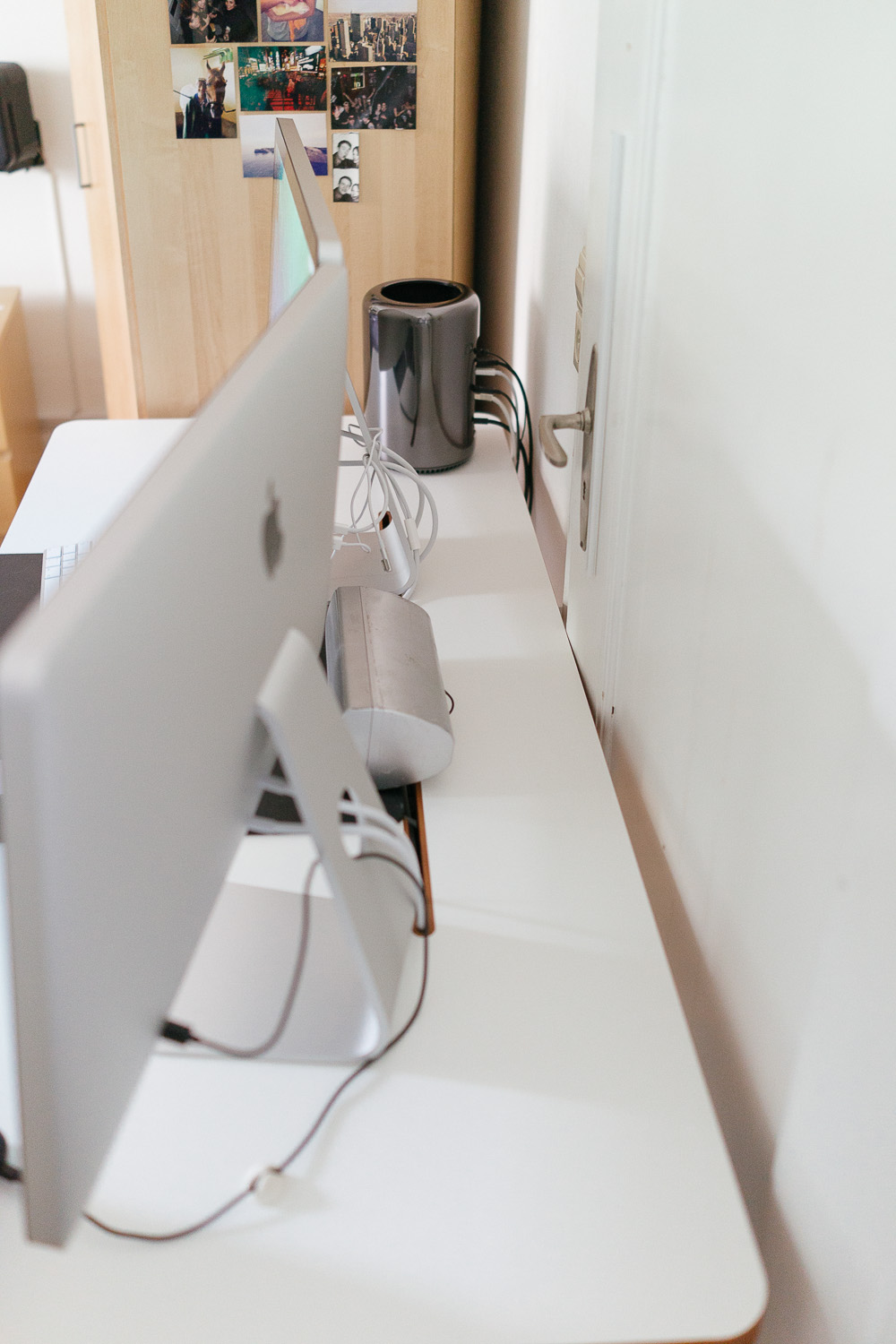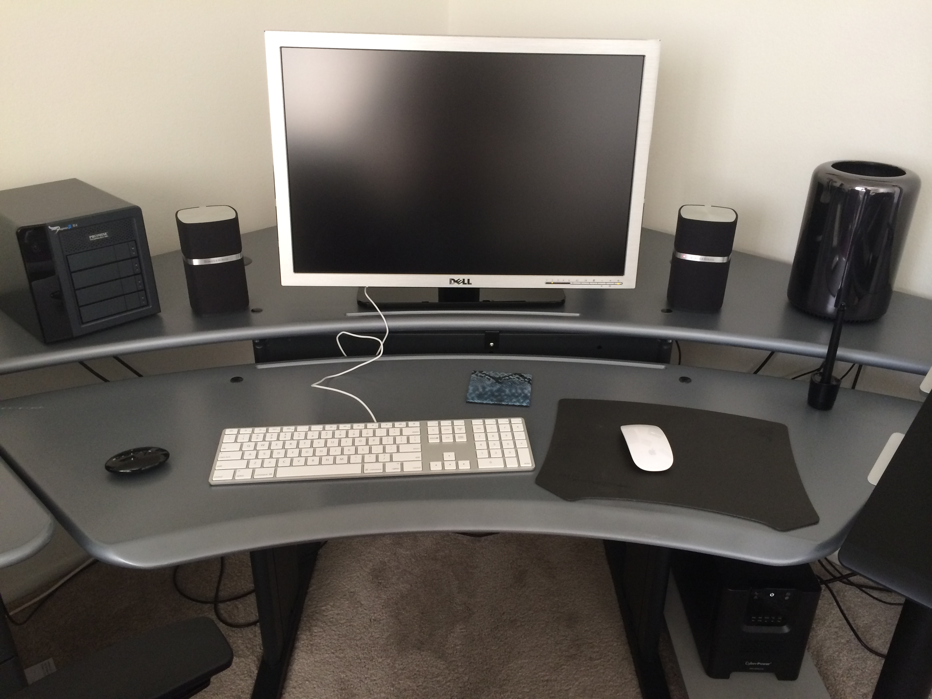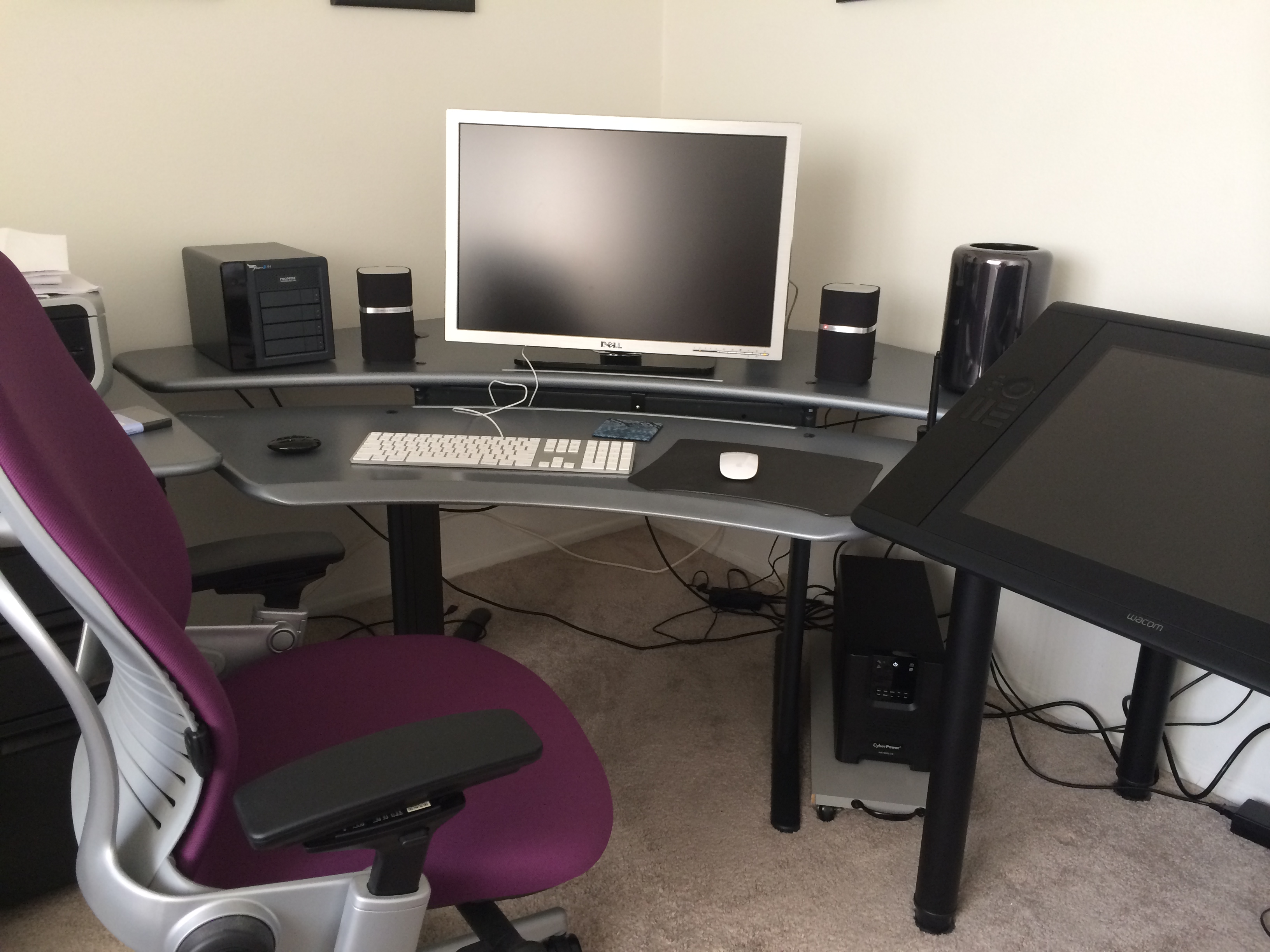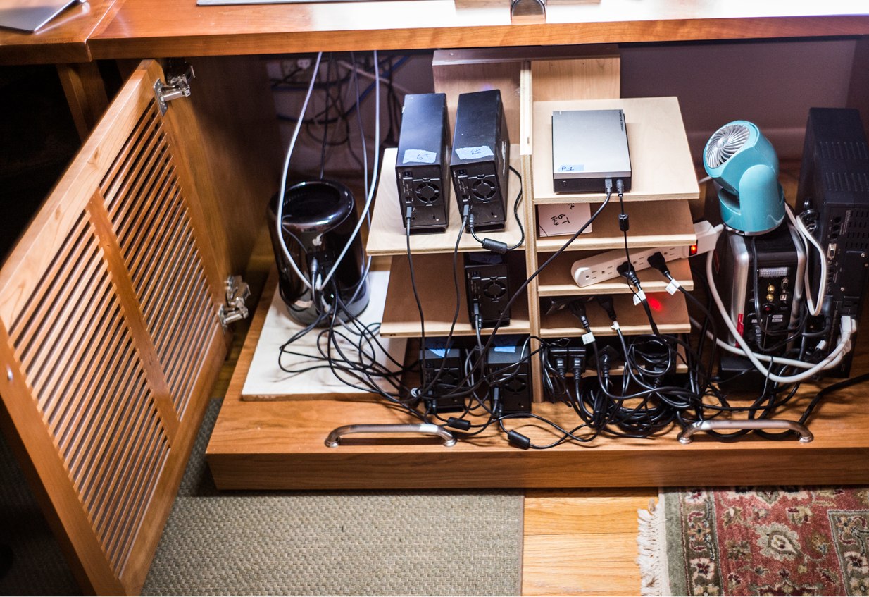 The Mac Pro cables go behind the back of the desk, and then inside it through a whole on the bottom, or directly to the raids, led on the backside of the table’s leg. From inside the desk, I distribute them to a usb 3 hub, to the hdds, and to the TB displays. [link]