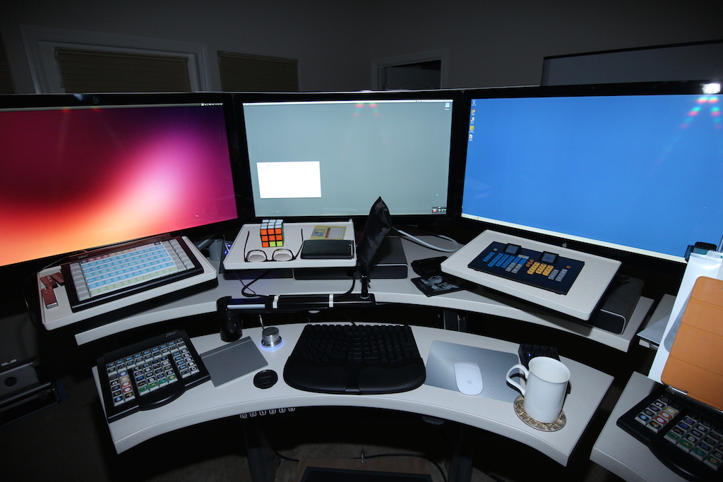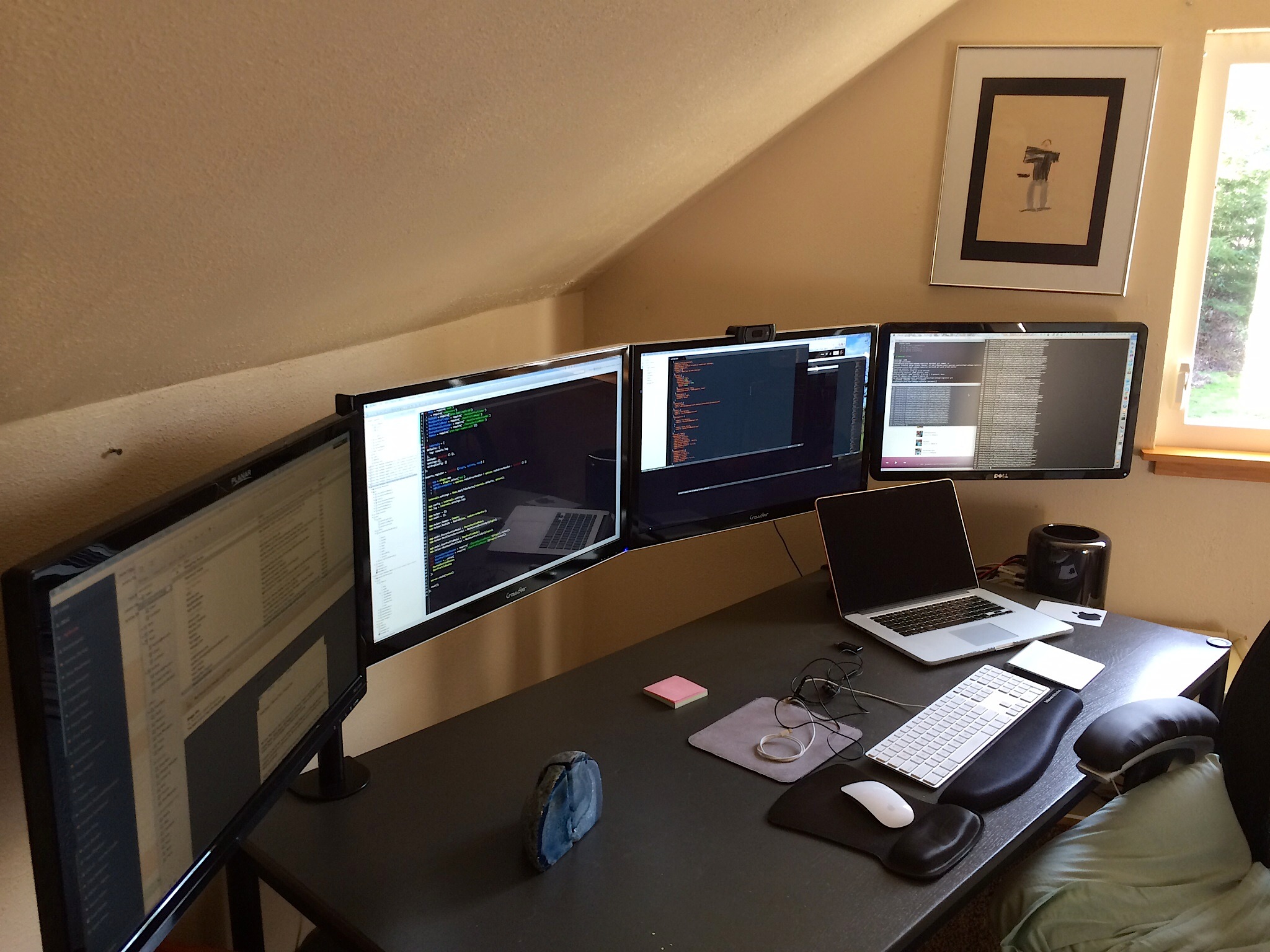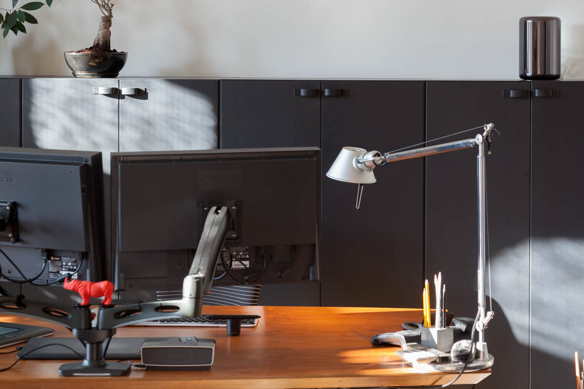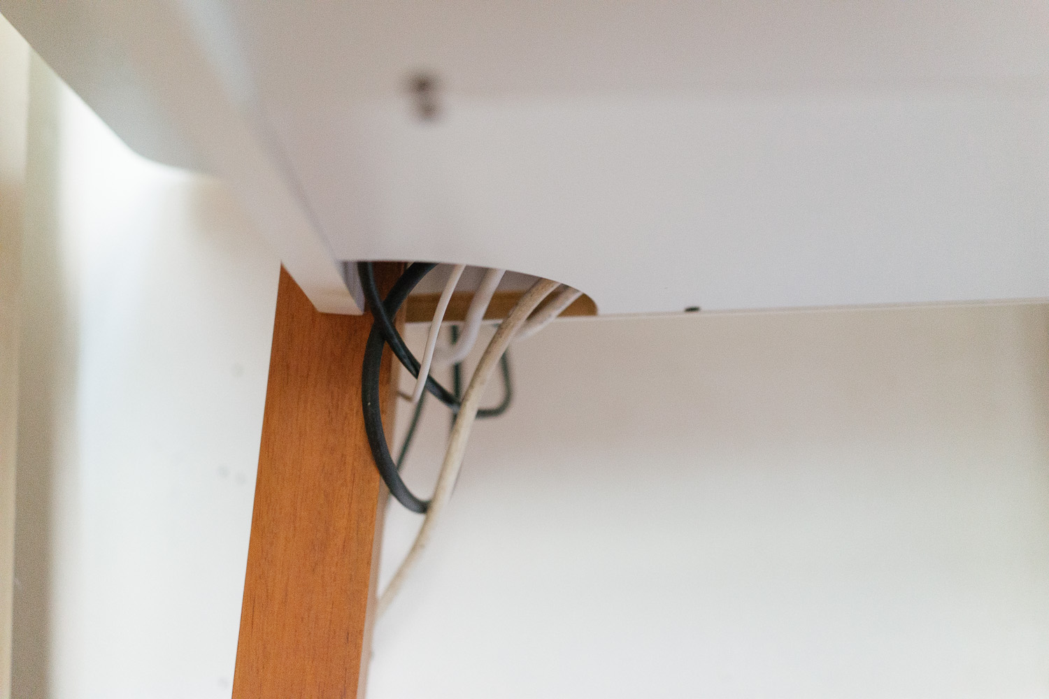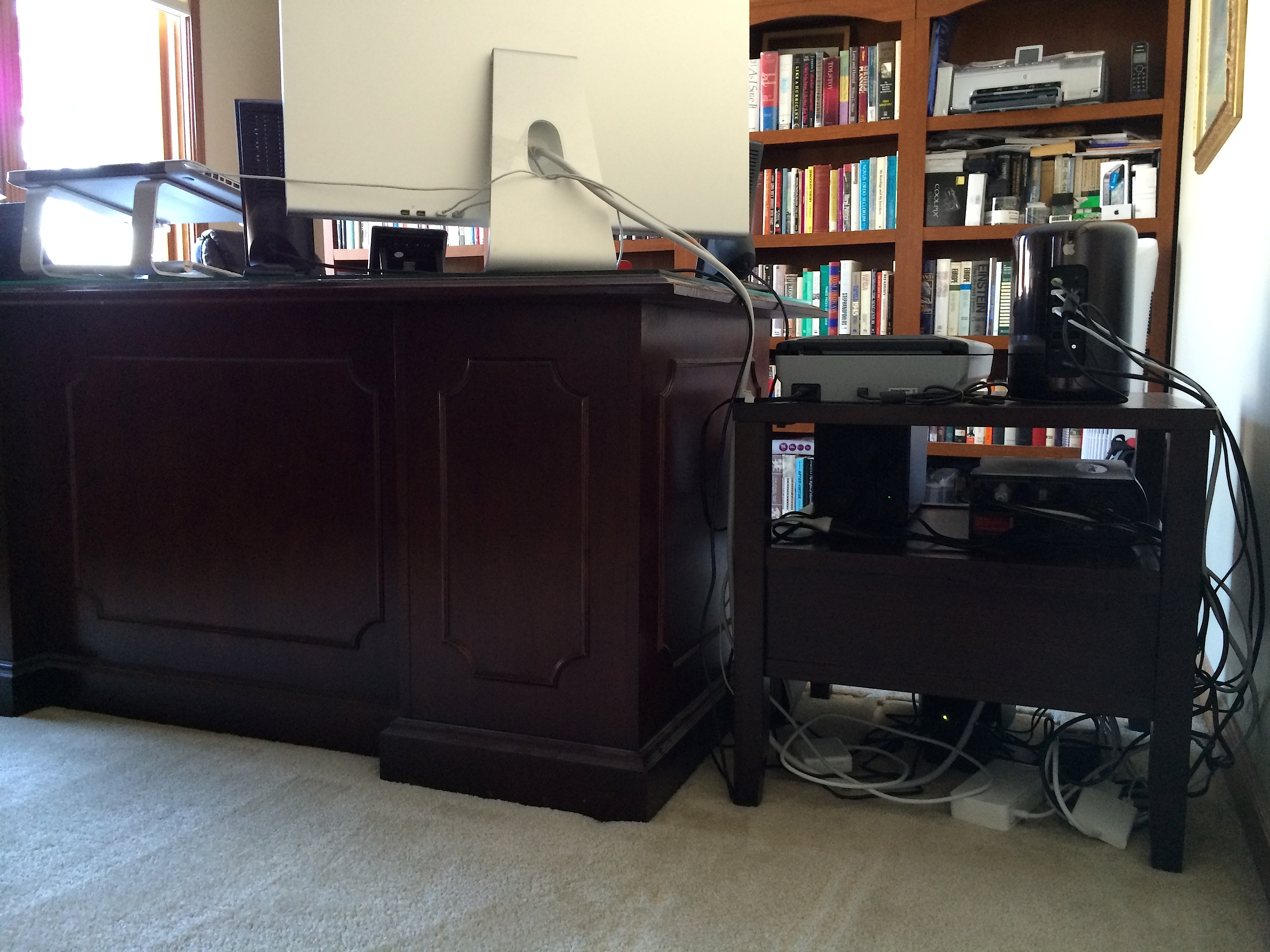 The Mac Pro cables go behind the back of the desk, and then inside it through a whole on the bottom, or directly to the raids, led on the backside of the table’s leg. From inside the desk, I distribute them to a usb 3 hub, to the hdds, and to the TB displays. [link]