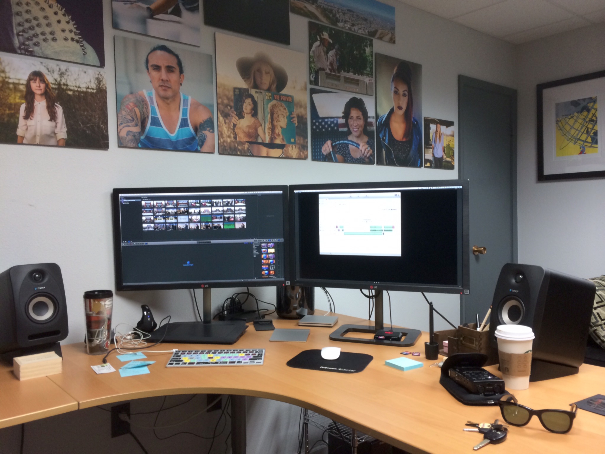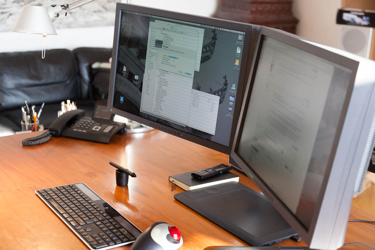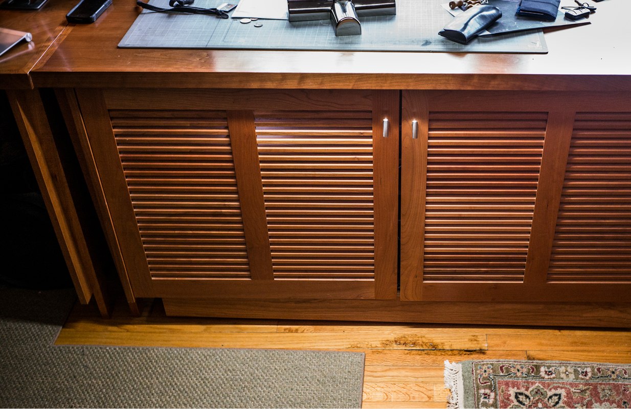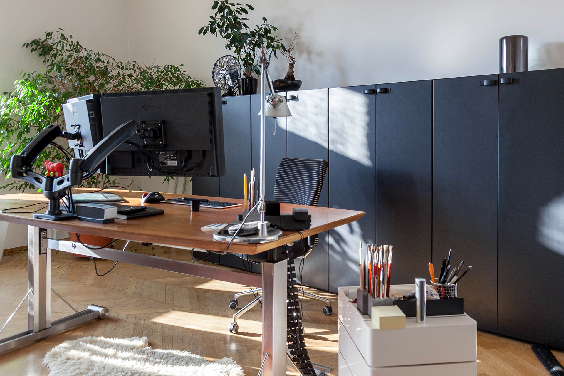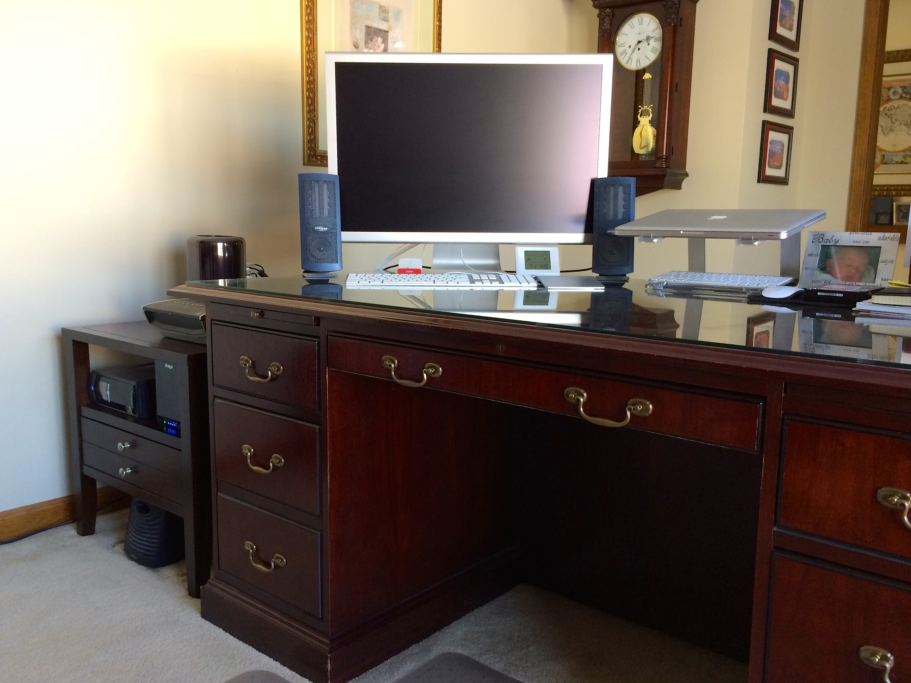The Mac Pro cables go behind the back of the desk, and then inside it through a whole on the bottom, or directly to the raids, led on the backside of the table’s leg. From inside the desk, I distribute them to a usb 3 hub, to the hdds, and to the TB displays. [link]