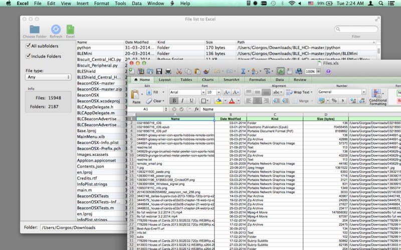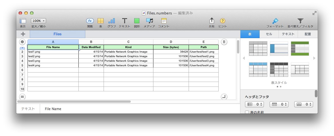 「File list to Excel」は選択したFinder内に入っているファイルをExcelファイル(xls)形式のリストに出力してくれるアプリです。