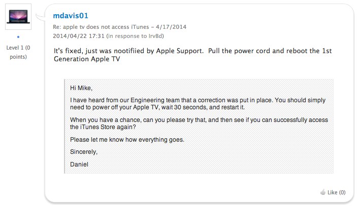 原因は「Heartbleed対策のためサーバー側の設定を変えたためではないか?」と噂されているそうですが定かではありません。また、「まだiTunes Storeに接続できない人は第1世代 Apple TVを再起動すると直ると思います」という解凍がApple サポートから返事があったという人もいるそうです。