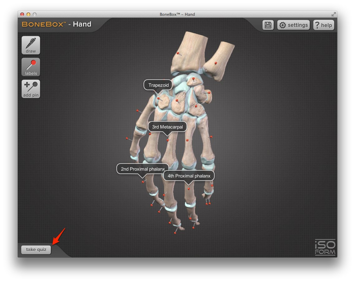 医療分野専門のアプリで使いどころが無さそうですが「Spine(背骨)」と「Hand(手骨)」はクイズモードがあり、実行すると骨がバラバラに別れどの部分の骨かを当てる選択問題が出題されます。