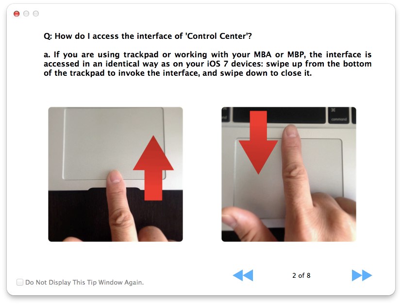 使い方はアプリを起動してトラックパッド下から引き出すようにスワイプしてやるとMacのディスプレイ下側からControl Centersが表示されます。また、マウスを使用している場合はディスプレイ下に表示されているボタンからも表示できます。