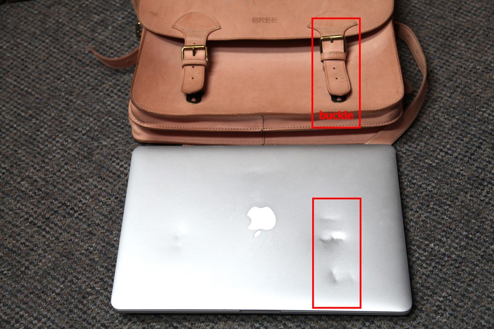 MacBook Pro Retina 15インチモデルを1TB SSDをBREEのバッグに入れたままの状態で車に引かれたそうでかろうじて動作しているようです。