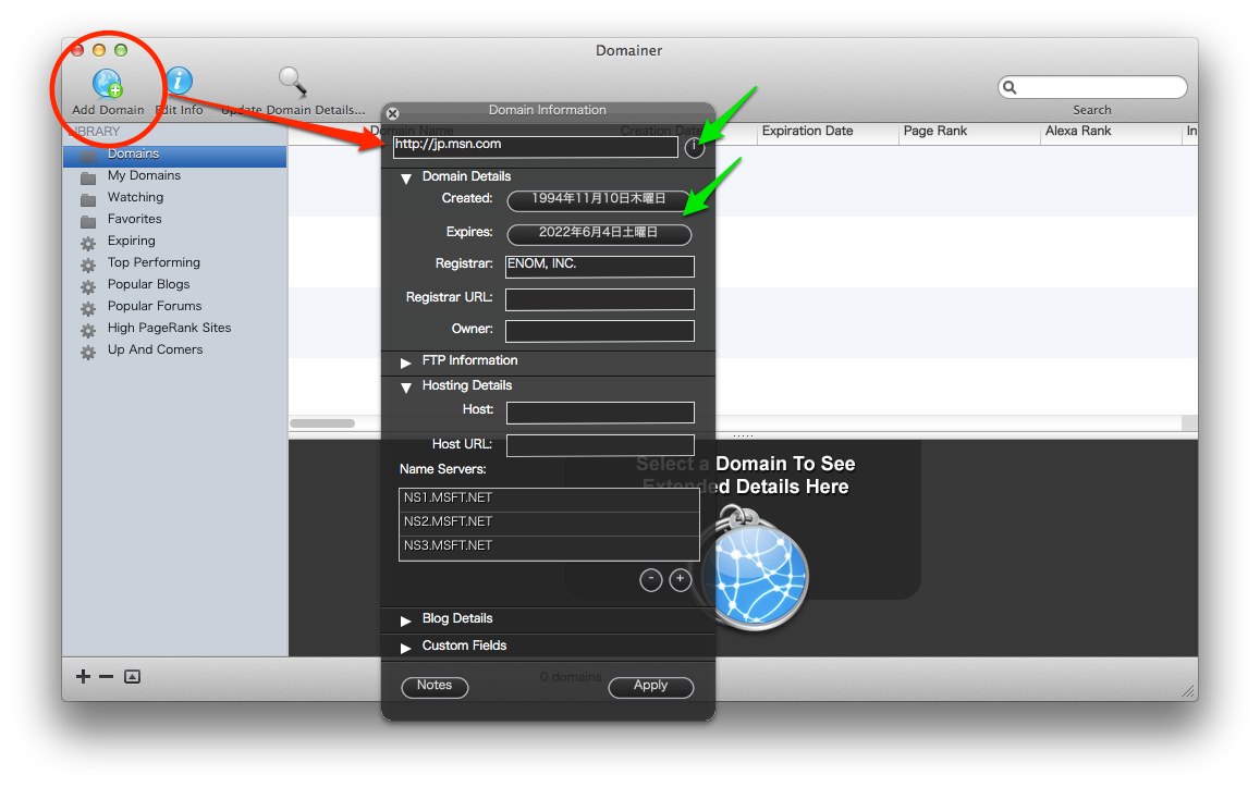 使い方は[Add Domain]で表示される「Domain Information」ウィンドウに調べたいドメインを入力し、「Retrieve」ボタンを押すと自動的にドメイン情報が入力されます。(*公開していないサイトでは使用できません)