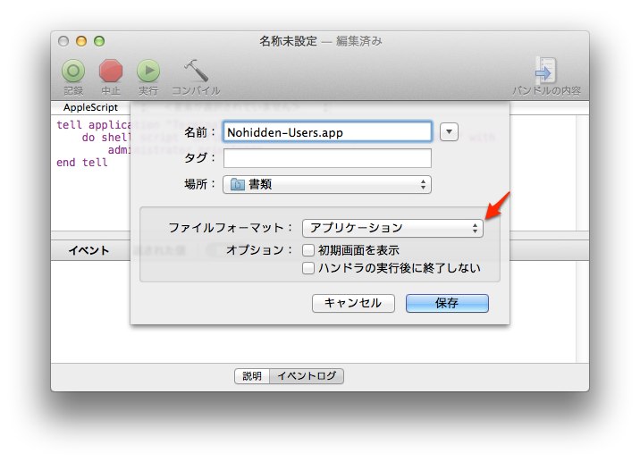 1.「/アプリケーション/ユーティリティ/AppleScript エディタ.app」を起動し以下のScriptを入力。