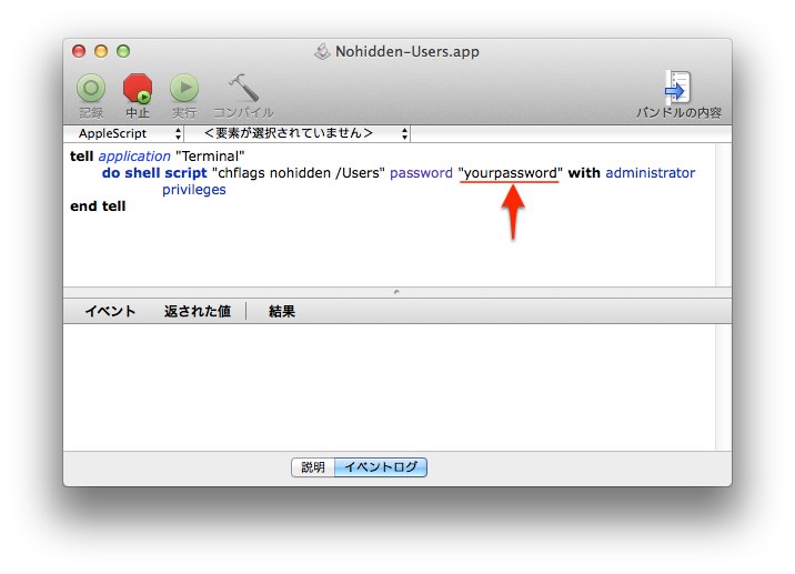 2.”yourpassword“(引用符内)にAdministratorパスワードを入力し、ファイルフォーマットを「アプリケーション」にして保存。