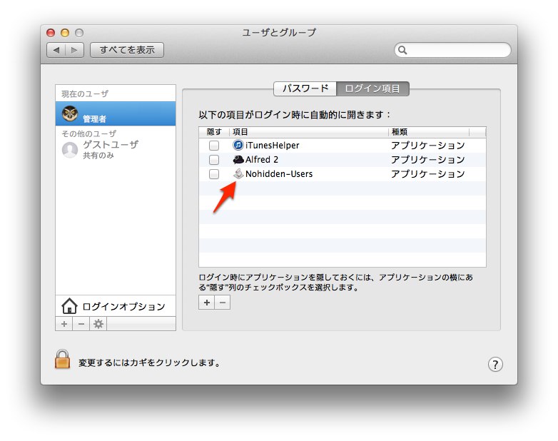 3.保存したアプリケーションをシステム環境設定の「ユーザーとグループ」のログイン項目に追加します。