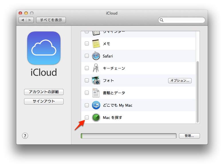 1.システム環境設定から[iCloud]を選択して[Macを探す]をOFFにする。