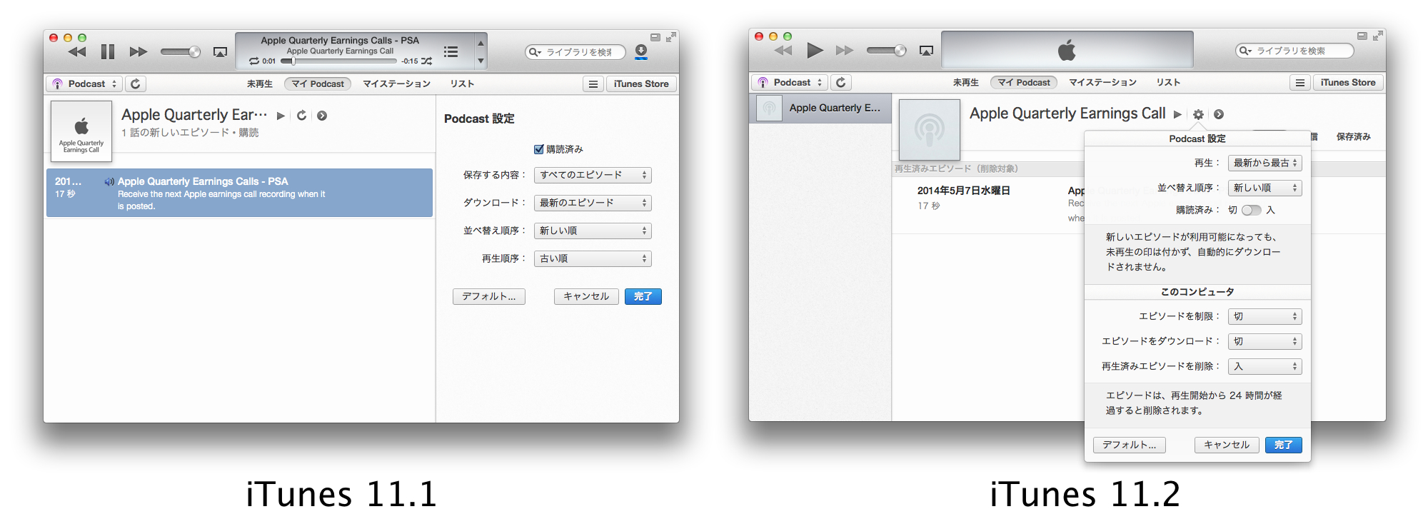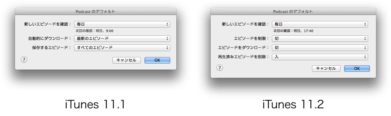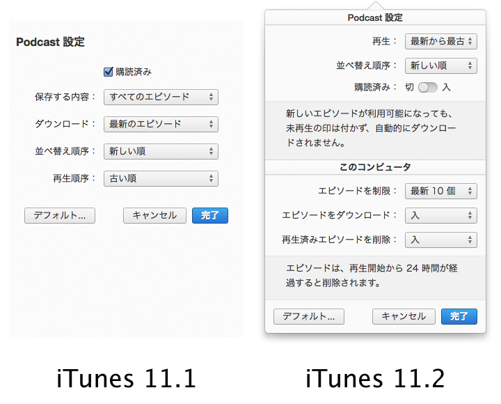 色々あったiTunes 11.2.xですが、iTunes 11.2ではPodcast UIの変更や再生やダウンロード設定が細かく設定できるようになったそうなので比較してみました。