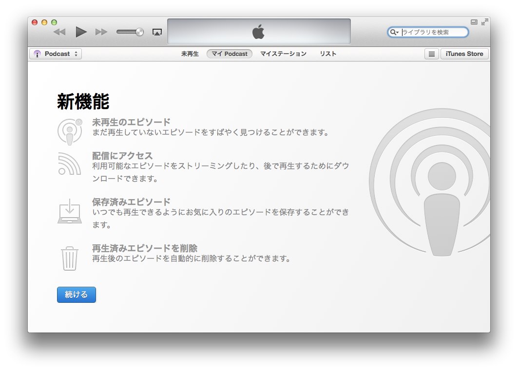 ・再生後にエピソードを自動的に削除できるようになりましたこのアップデートでは、Genius のアップデート時に iTunes が応答しなくなる問題も修正され、全般的なパフォーマンスと安定性も向上します。Podcast エピソードの同期には、iOS 用 Podcast 2.1 以降が推奨されます。