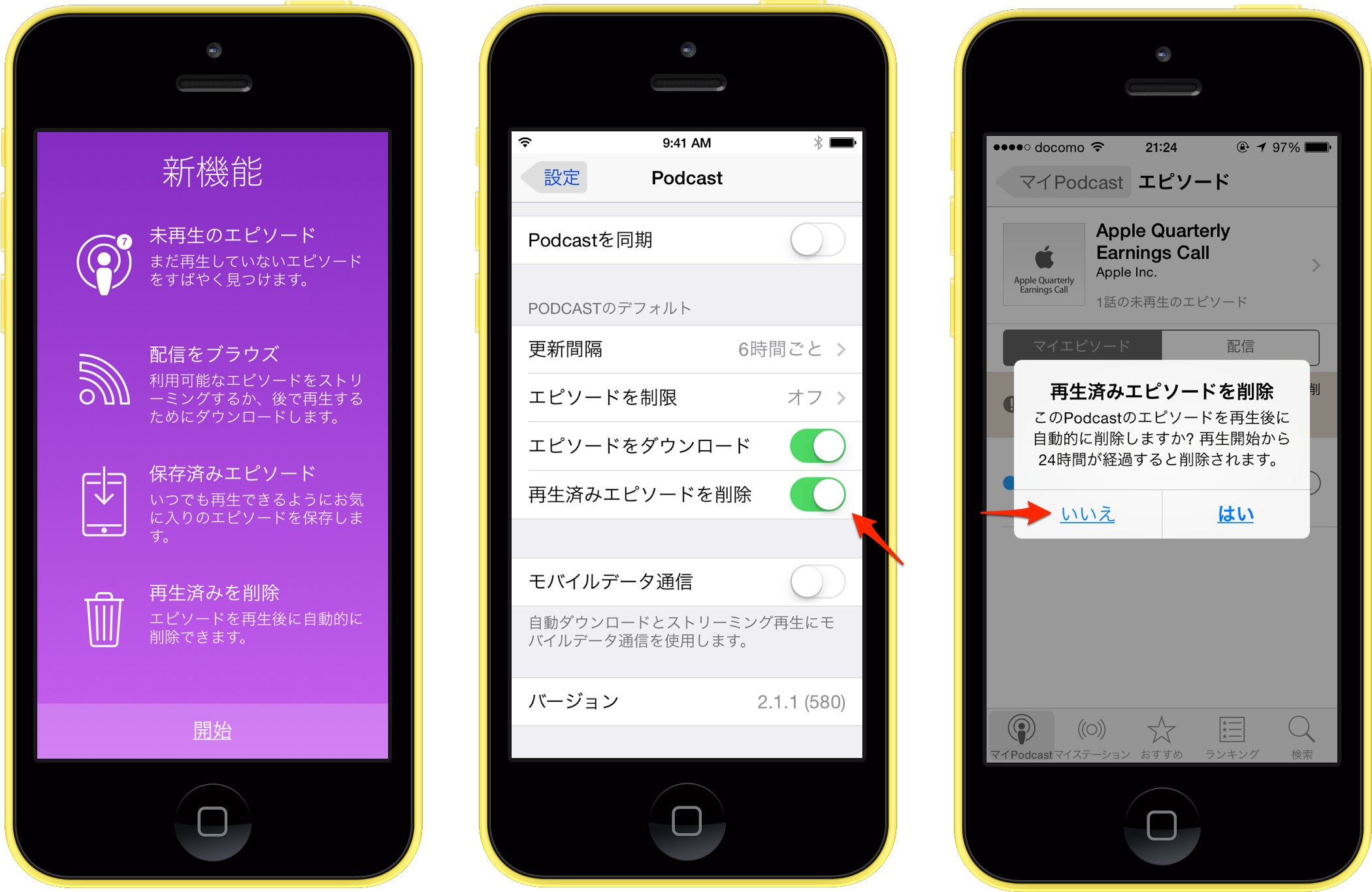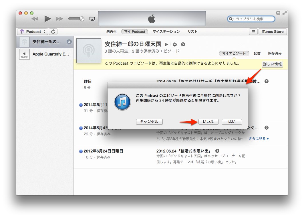 1.Podcastを登録した際に表示される「このPodcastのエピソードは、再生後に自動的に削除できるようになりました。」の[詳しい情報]で表示されるダイアログで「いいえ」を選択。